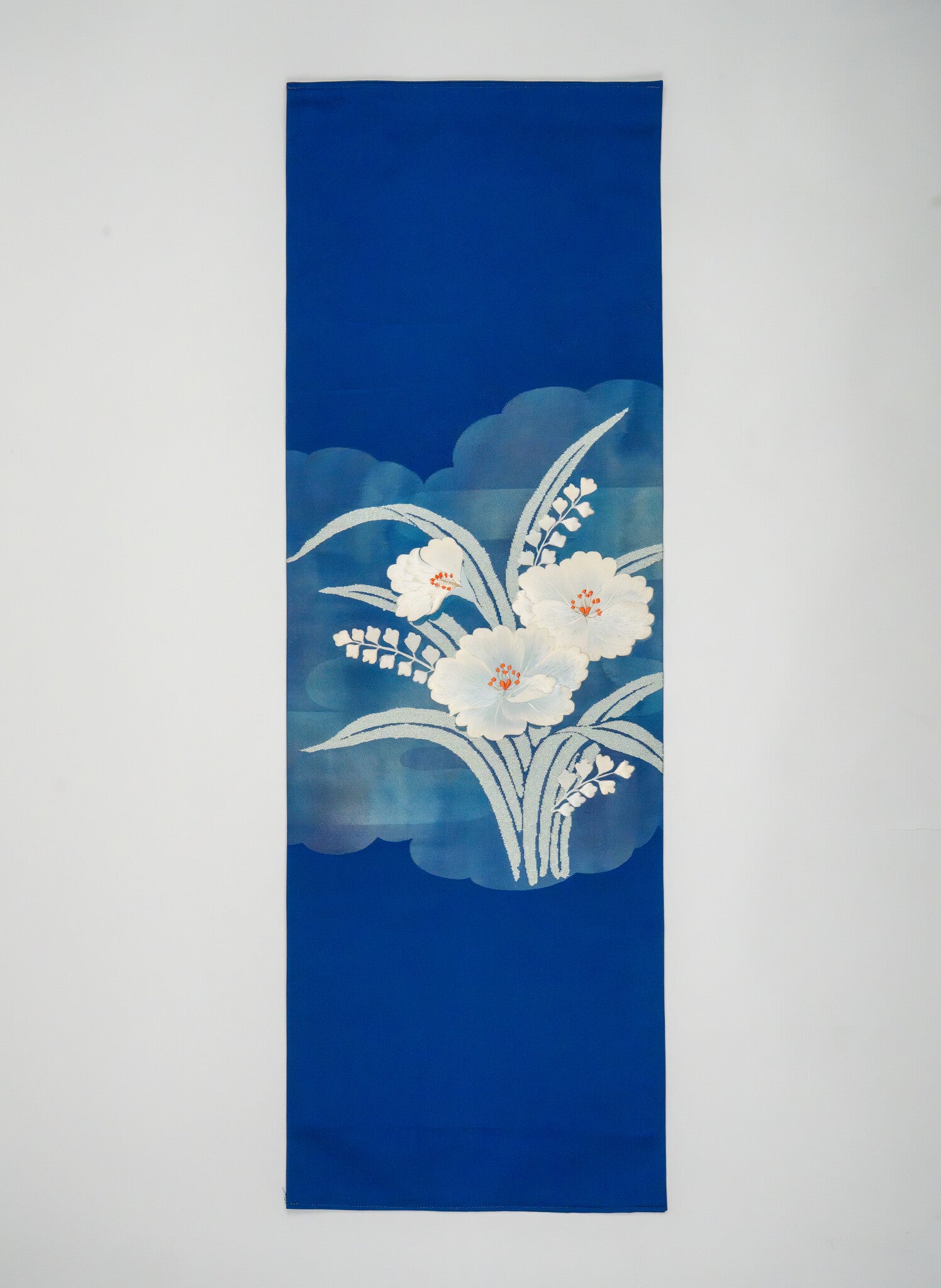 The textile features a bold embroidery of White Hibiscus (Mukuge) and delicate fern-like foliage. In the tea ceremony, the Hibiscus is celebrated for its "gentle humility" and its ability to bloom continuously throughout the summer heat. The stark contrast of the pearl-white petals against the deep blue void creates a graphic, modern look that commands attention without being "loud."