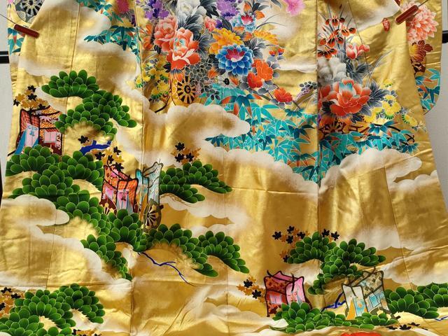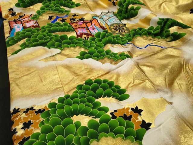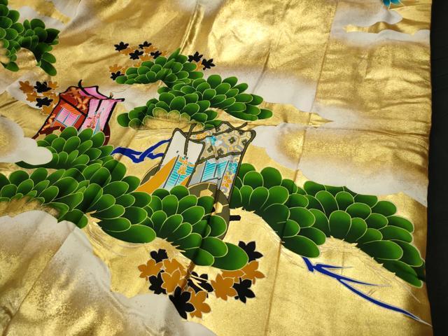 Meaning "Great Crown," the Taikan is designed to drape the bride in elegance and splendor as she departs for her new life. The design is centered on the Pine tree—a symbol of longevity and deep peace. As the ancient verse sings of "Midori for a thousand years," the evergreen color painted here represents a wish for prosperity and enduring strength through all four seasons.