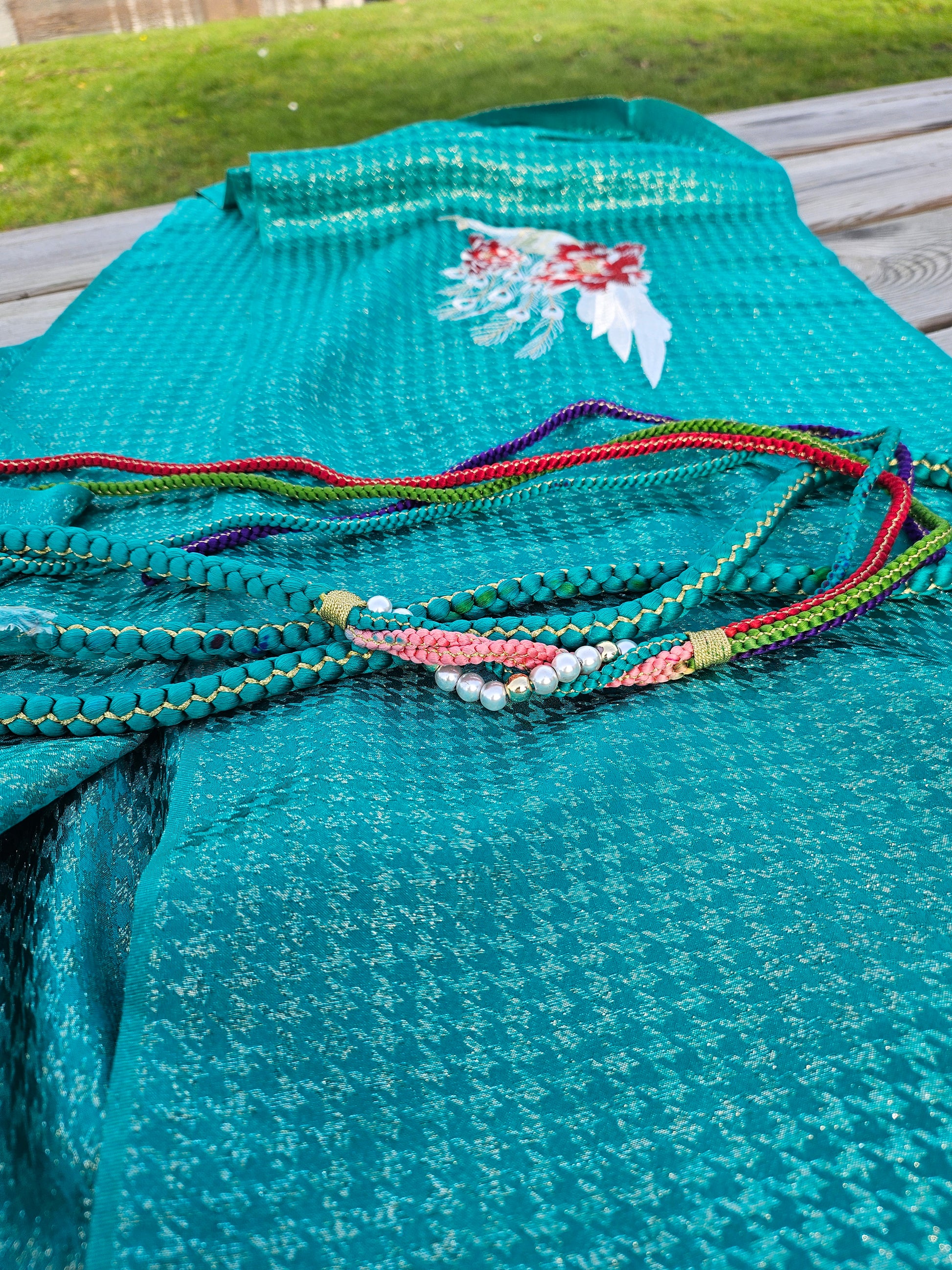 Woven from 100% pure, luxurious silk, this exquisite piece is a celebration of both opulence and tradition. The fabric is rendered in a deep, captivating Teal hue, featuring a subtle, self-patterned damask weave that catches the light with a gentle shimmer.