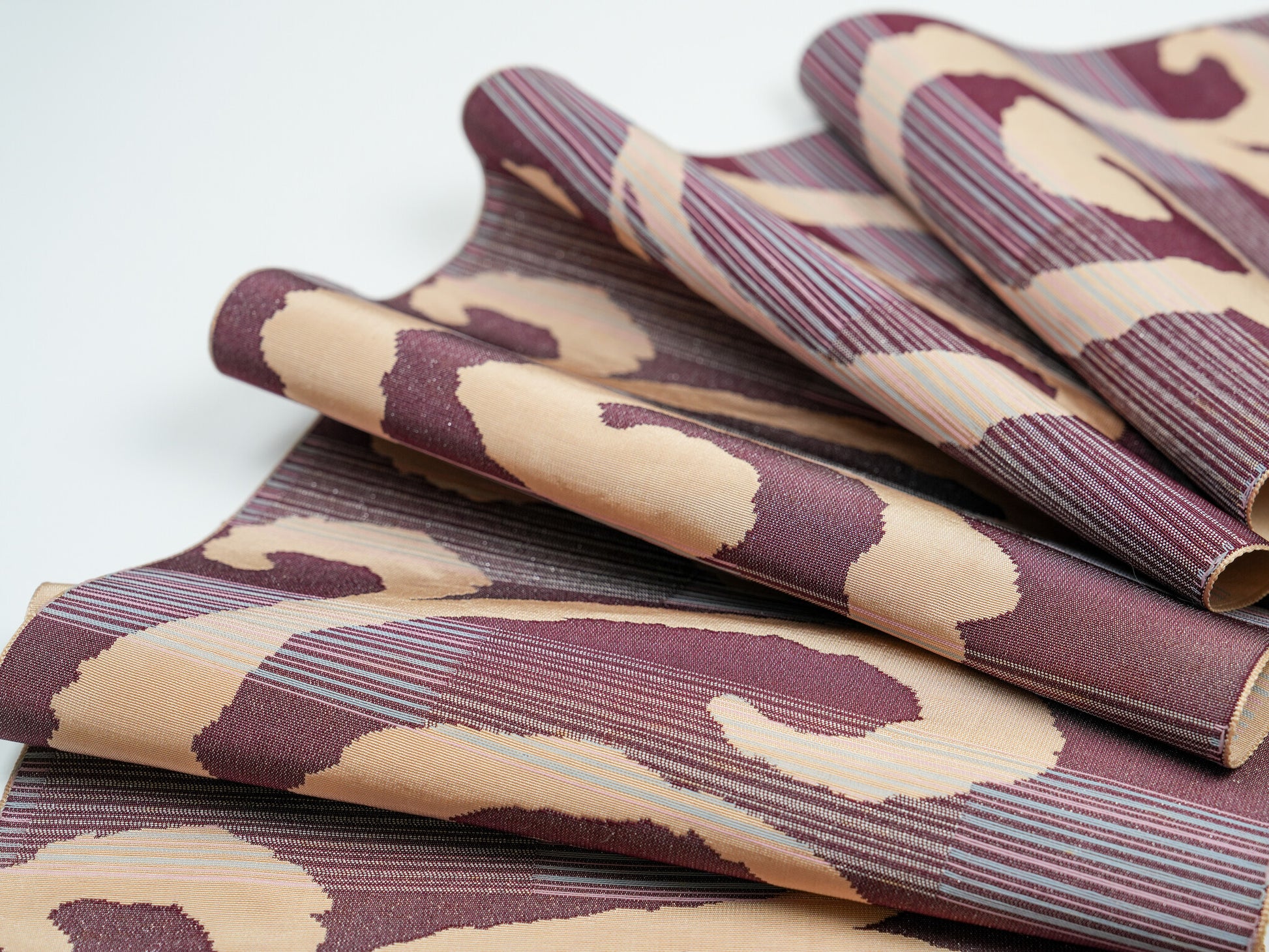 Indulge in the dramatic depth of the "Baroque Swirl." Crafted from 100% pure vintage silk using a complex Jacquard weave, this runner features a saturated Oxblood base illuminated by abstract Champagne Gold swirls. Subtle horizontal striations in faint blue and pink add a velvet-like textural mastery found only in antique textiles. It transforms your dining table or grand piano into a focal point of historical luxury. A future heirloom for the discerning collector. Only one exists.