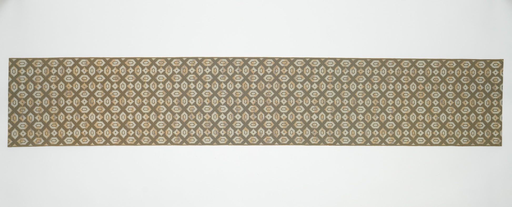Define the geometry of refinement with the "Geo-Symmetry" runner. Woven from fine vintage silk, this piece features a soothing, rhythmic pattern of interlocking hexagons and diamonds in muted platinum, oatmeal, and champagne tones. The fabric possesses a fluid drape and refined sheen that brings quiet luxury to minimalist interiors or glass consoles. A timeless, understated masterpiece for the modern curator. Only one piece exists in the world.