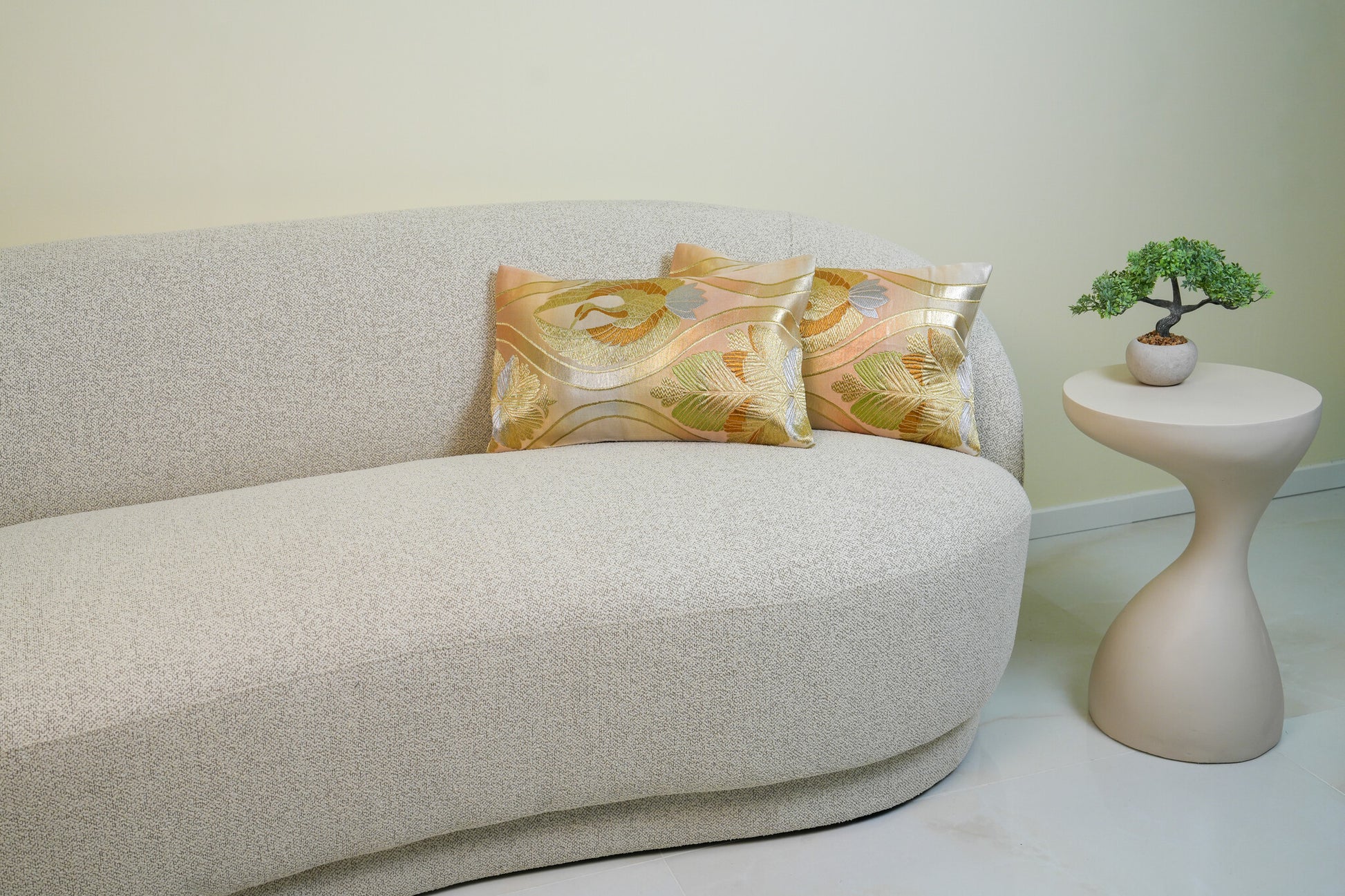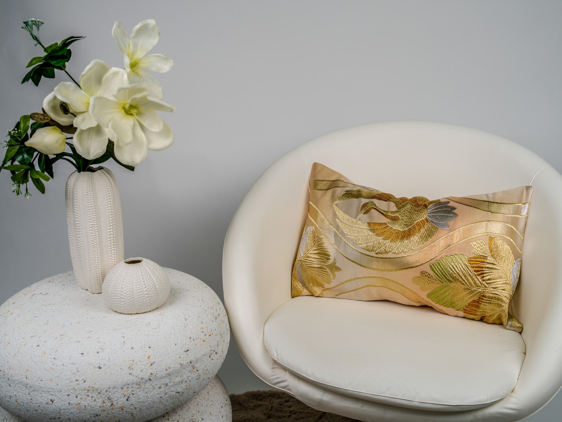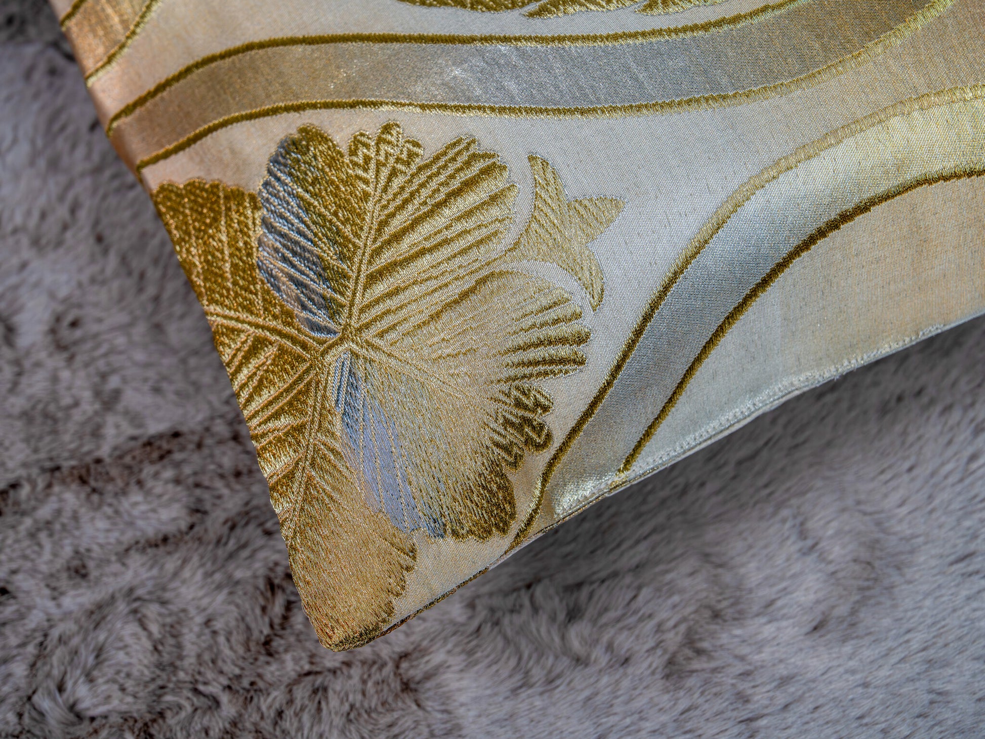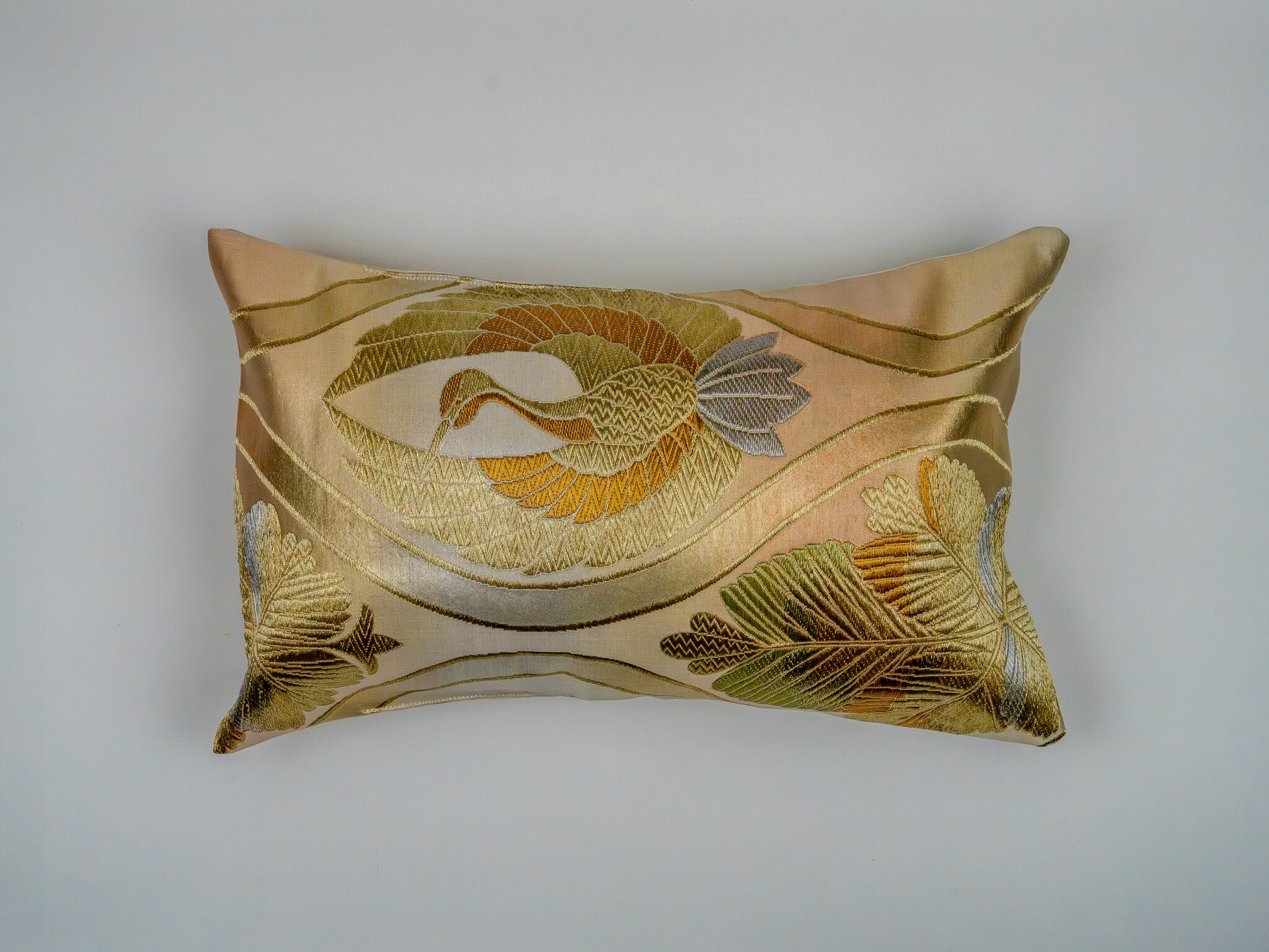 The motif is executed in varying textures of gold and silver thread against a smooth, luminous champagne silk ground, offering a "bridal" elegance that is both understated and commanding. Hand-tailored from an authentic vintage Japanese Obi, this 30x50cm art piece features a seamless envelope closure to maintain the purity of the design. As a refined expression of sustainable luxury, it serves as a high-end interior accent for spaces that require a touch of grace without visual noise.