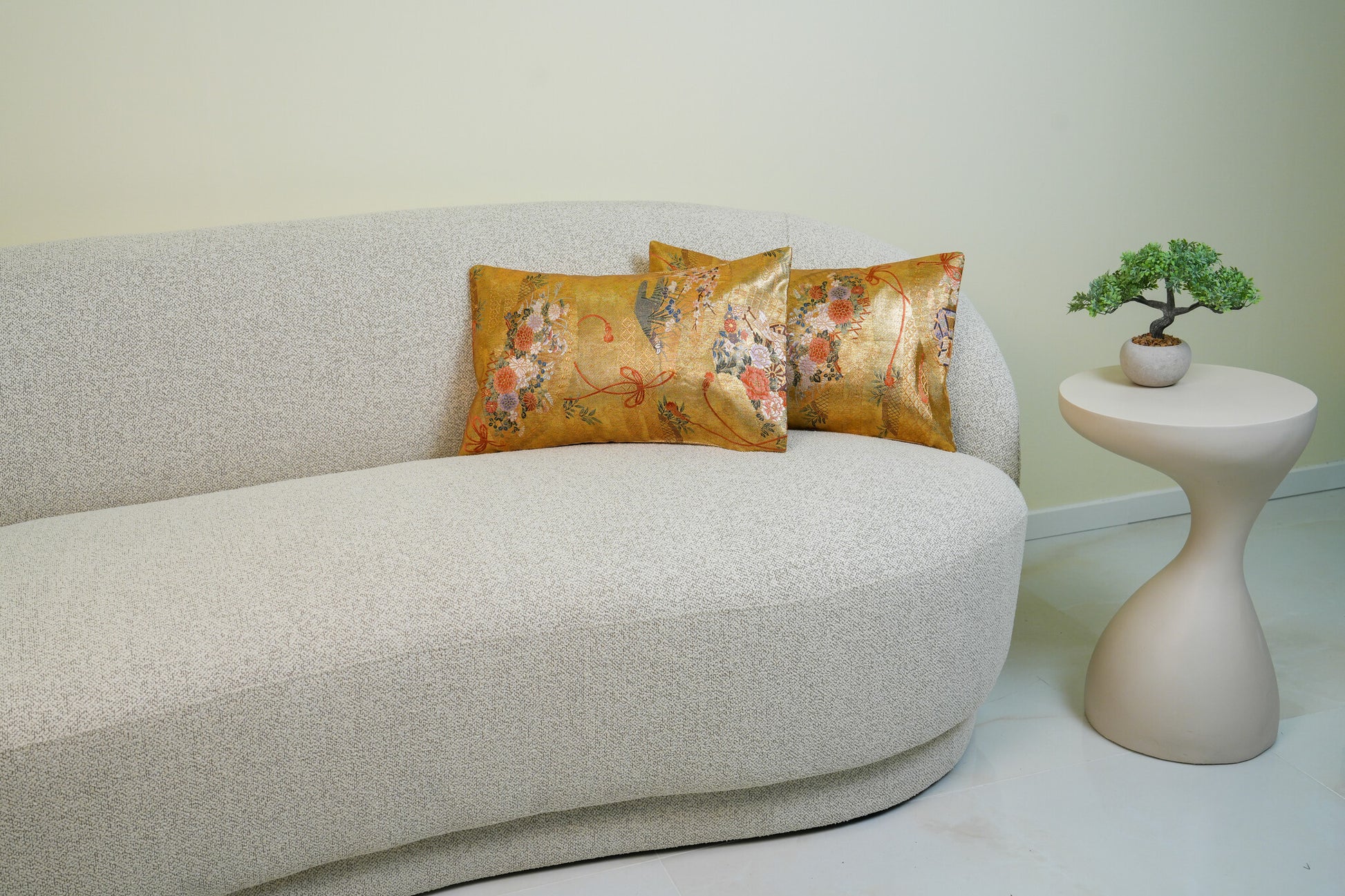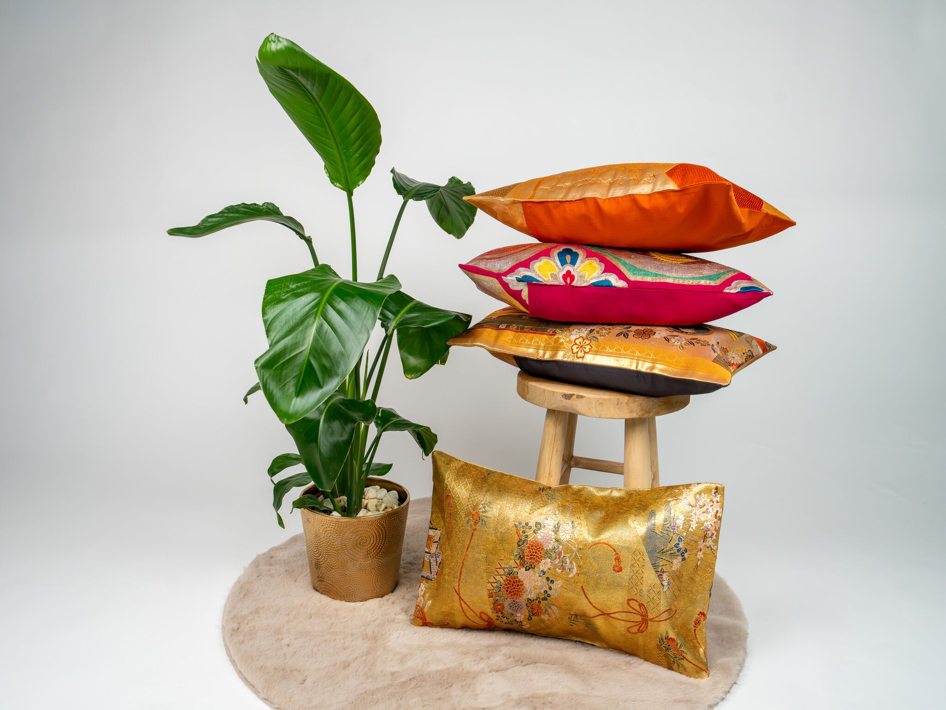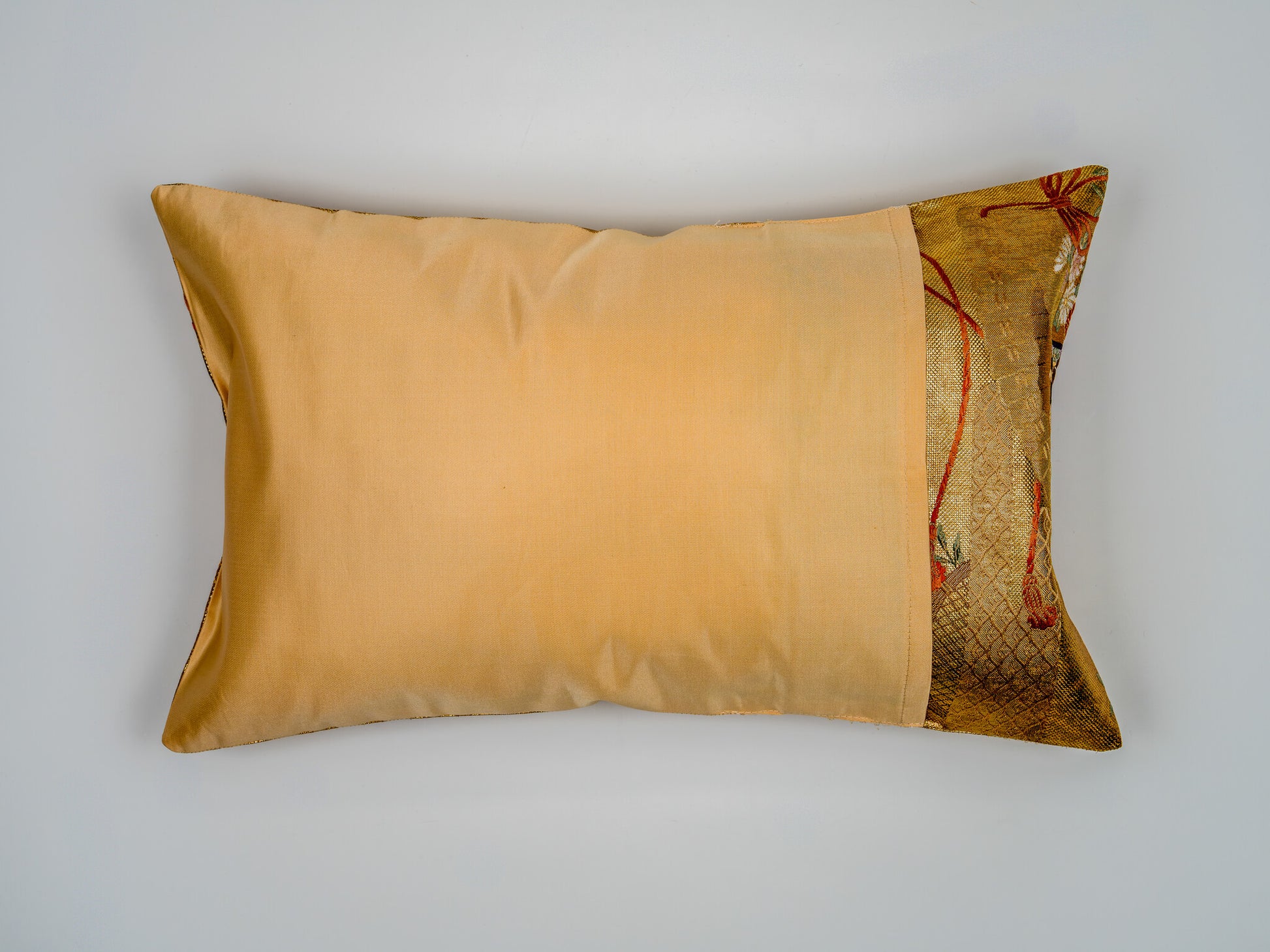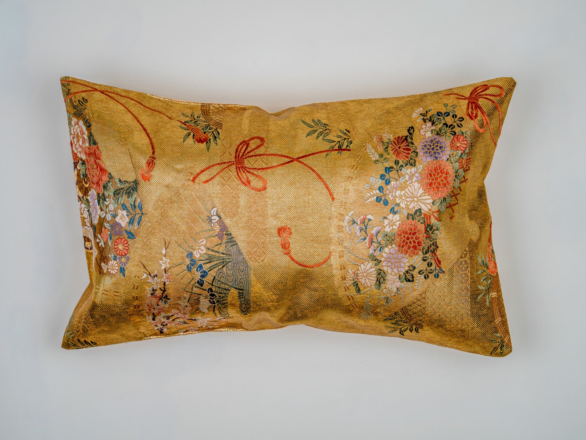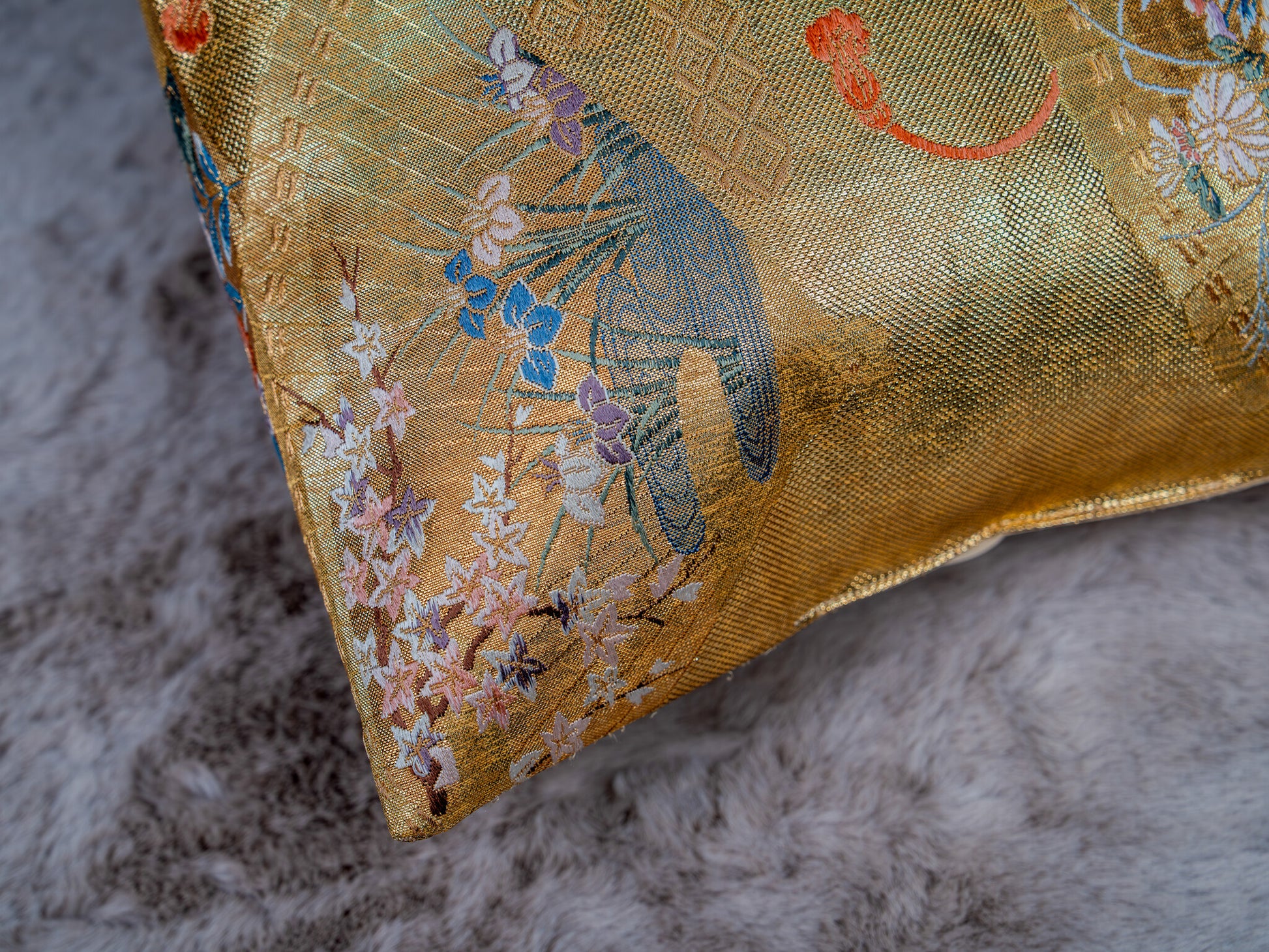 The fans serve as elegant vessels for a profusion of Sakura (cherry blossoms) and Kiku (chrysanthemums), embroidered in delicate shades of violet, vermilion, and powder blue, tied together with ceremonial decorative cords. Hand-tailored from an authentic vintage Japanese Obi, this 30x50cm heirloom piece includes a seamless envelope closure to preserve the golden continuity of the design. As a luminous expression of sustainable luxury, it acts as a high-end interior accent that imbues the home with light and imperial history.