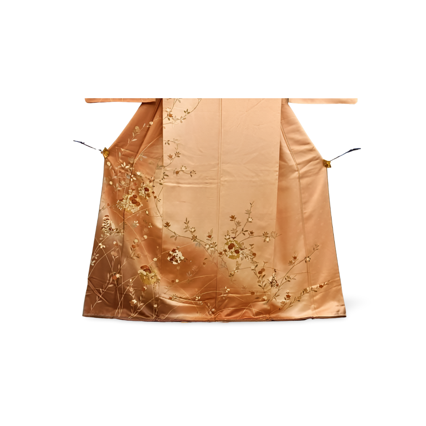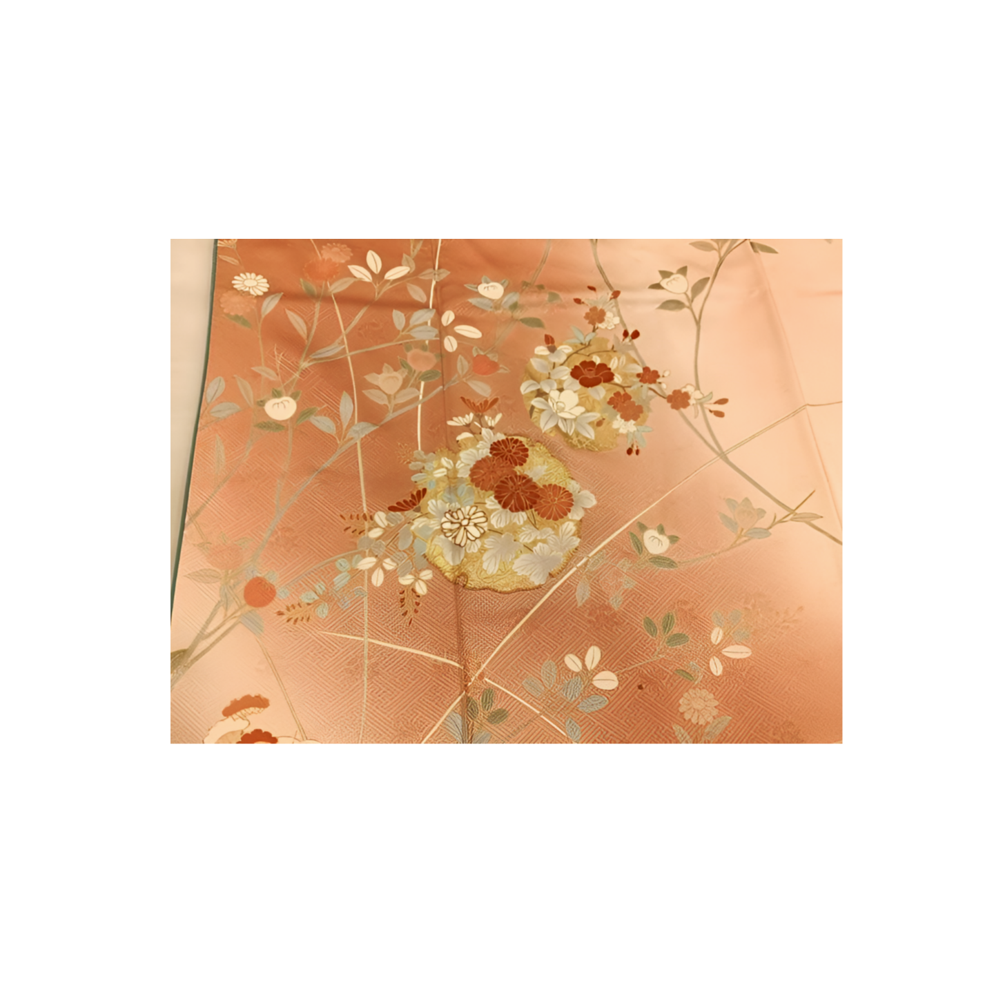 A Harmony of Seasons The canvas is a breathtaking expanse of heavy, fluid silk, dyed in a sophisticated gradation (Bokashi) that melts from a warm imperial apricot into a delicate blush pearl. This color palette is universally flattering, evoking the soft light of a Mediterranean sunset.