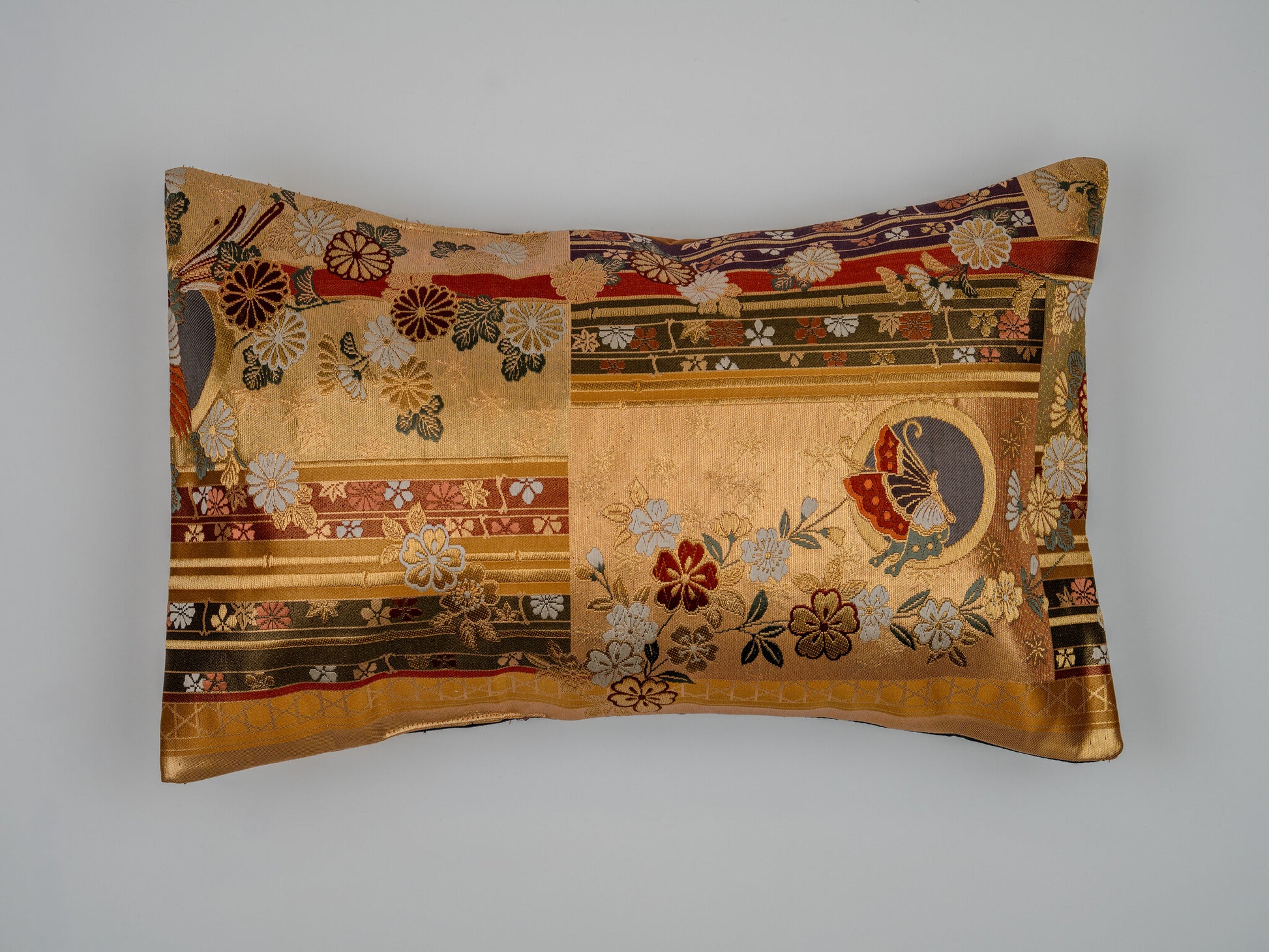 The complexity of the weave, with its precise metallic detailing and varied textures, showcases the pinnacle of Japanese textile art. Hand-tailored from an authentic vintage Japanese Obi, this 30x50cm heirloom includes a seamless envelope closure, preserving the flow of this legendary tableau. As a piece of sustainable luxury, it stands as a high-end interior accent that transforms a room into a sanctuary of culture and prosperity.