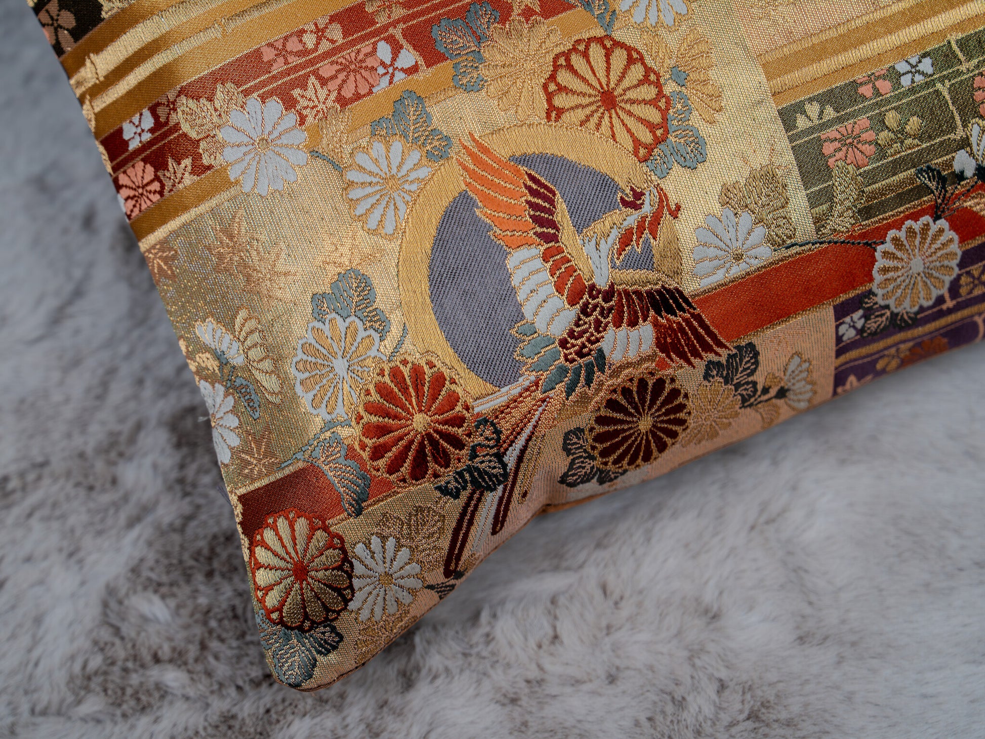 Invite a narrative of peace and celestial grace into your home with The Imperial Ho-o Legend by Renaras. This bespoke cushion is a woven masterpiece featuring the mythical Ho-o (Phoenix)—a sacred bird believed to appear only during eras of harmonious rule—soaring amidst auspicious Kiku (chrysanthemums) and joyful Cho (butterflies). The design is structured in elegant horizontal bands of rust-red, deep purple, and matcha green against a radiant gold silk ground, reminiscent of a classic Emakimono picture scroll.