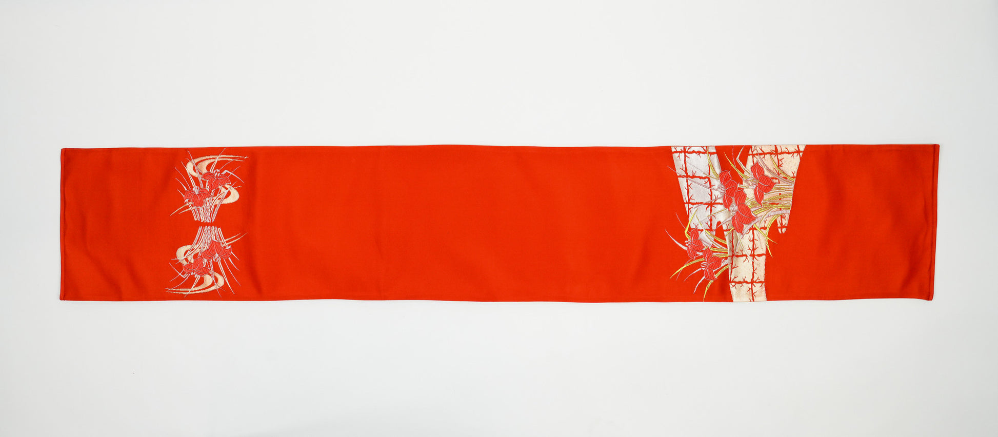 Ignite your tablescape with the sacred warmth of Shuiro vermilion. This breathtaking runner transforms your dining room into a seat of power, crafted from heavyweight vintage Fukuro Obi silk. The ends explode with three-dimensional Kin-gin-shi—real gold and silver threads woven into a stylized Floral Sheaf motif symbolizing abundance. The unadorned center offers profound elegance to highlight your centerpiece. A singular textile masterpiece for the discerning host. Only one piece exists in the world.