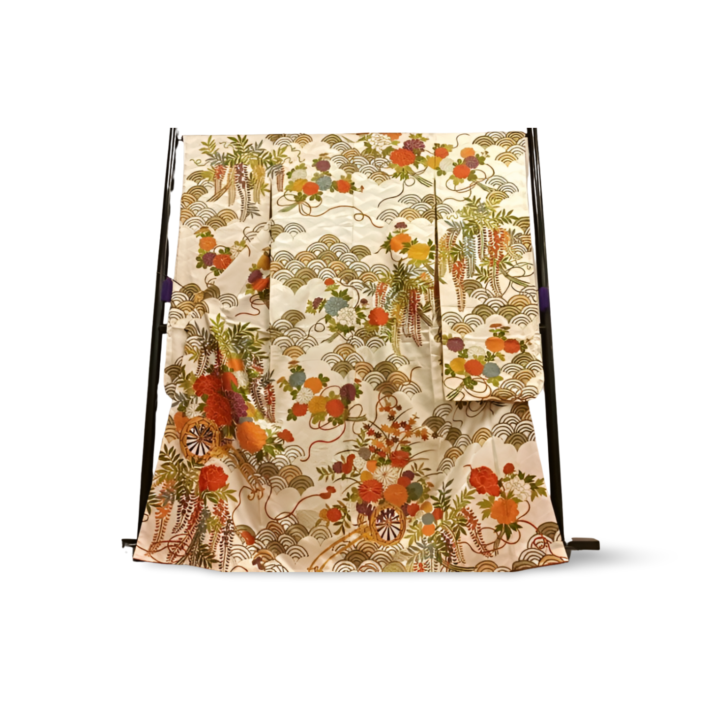 A Canvas of Purity and Splendour The foundation of this masterpiece is a lustrous, heavy-gauge Pure Silk (Rinzu) in a shade of creamy imperial white. In the world of vintage Japanese textiles, a white base of this calibre is exceptionally rare; it is an unforgiving canvas that demands perfection.