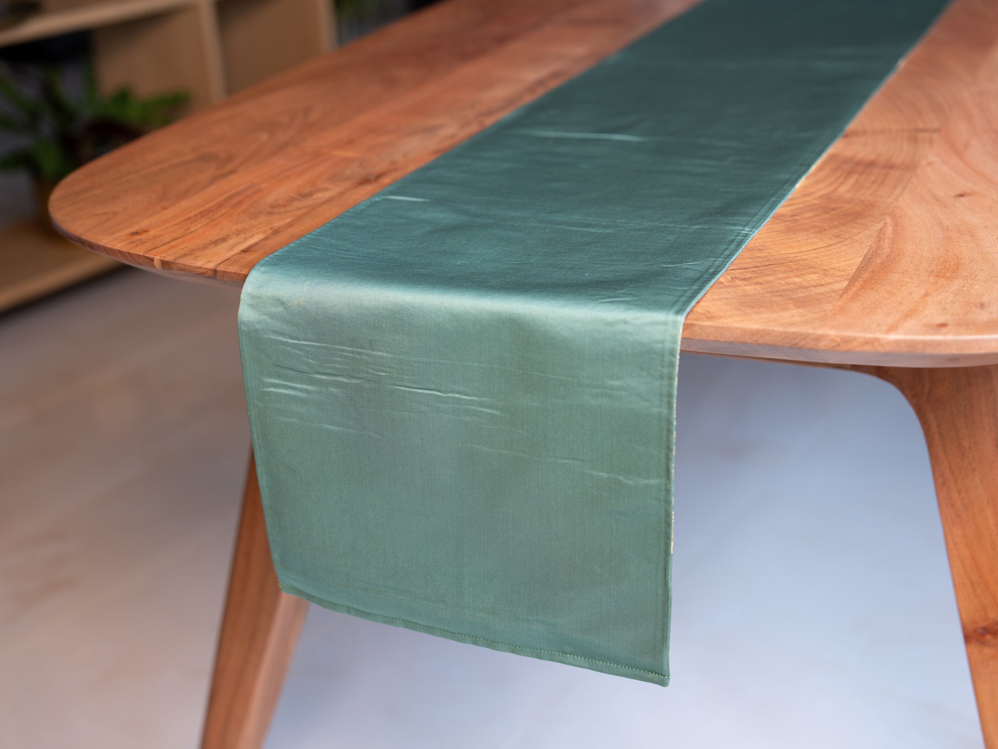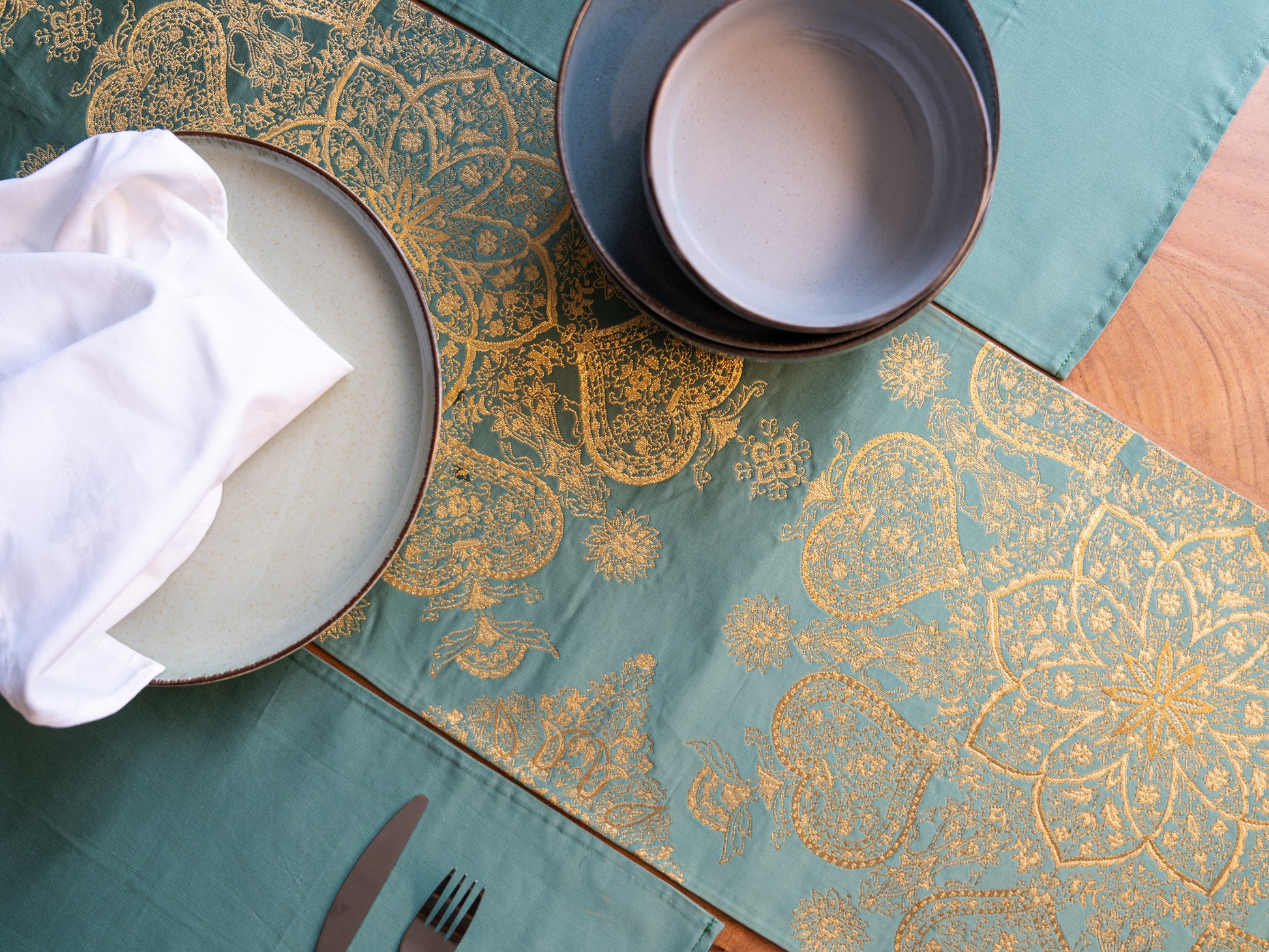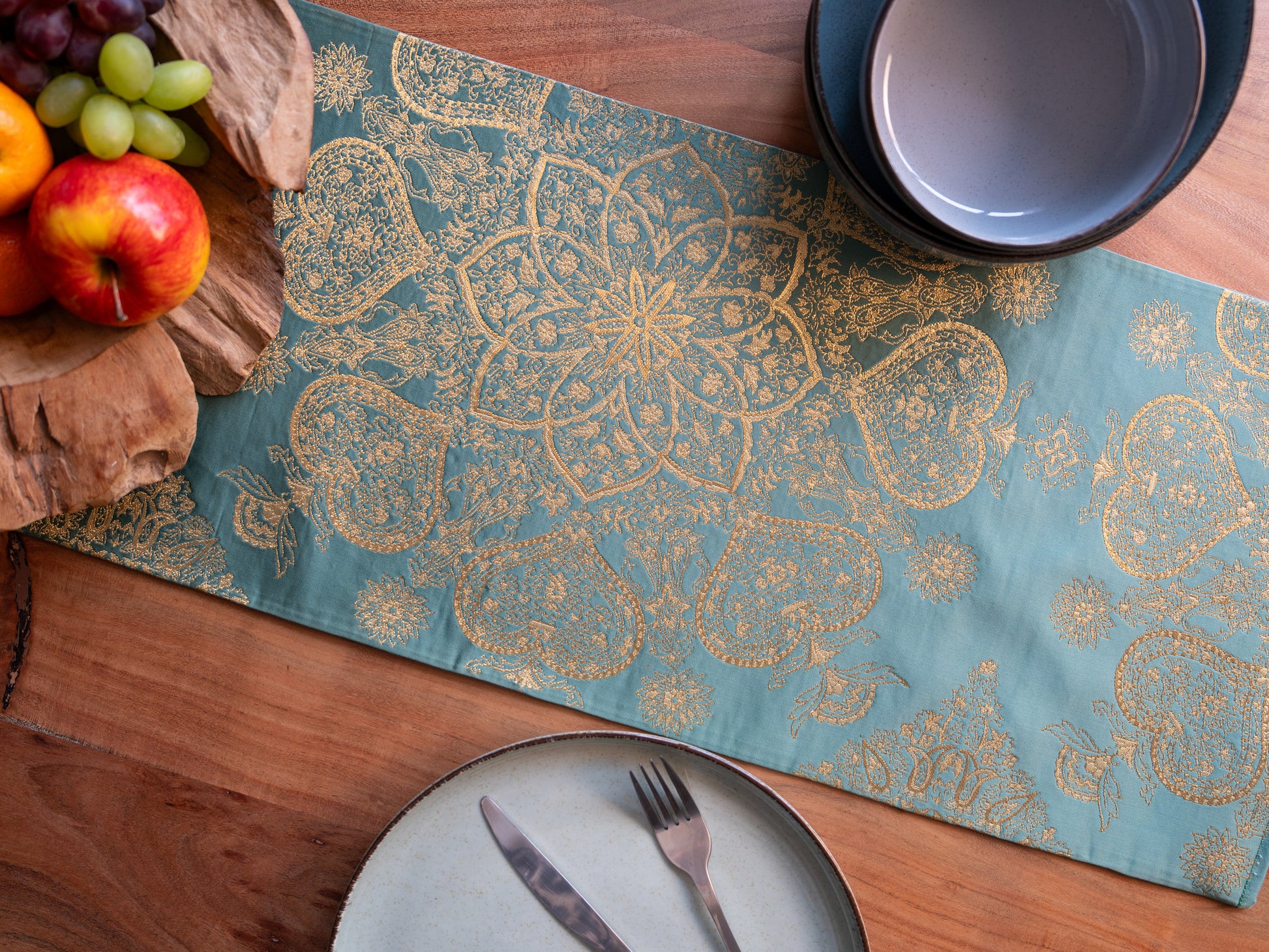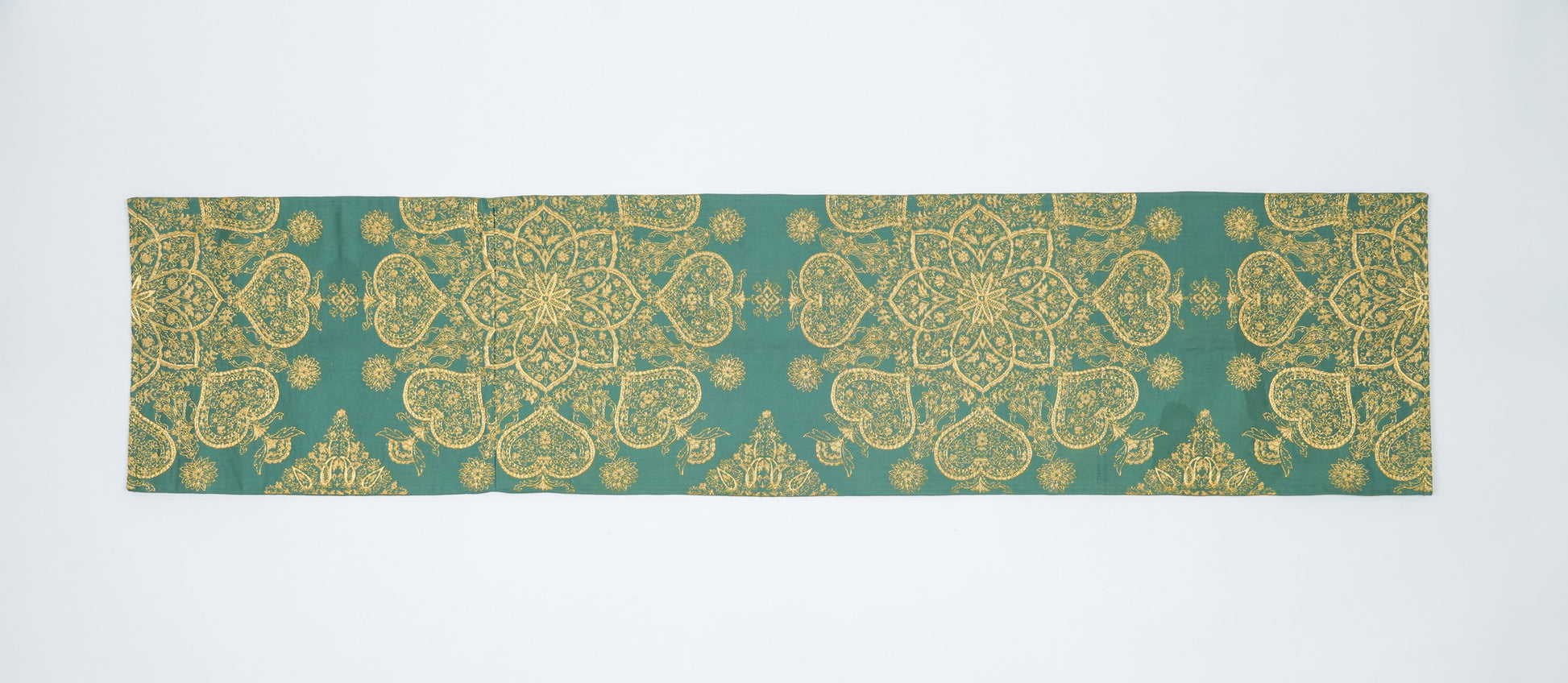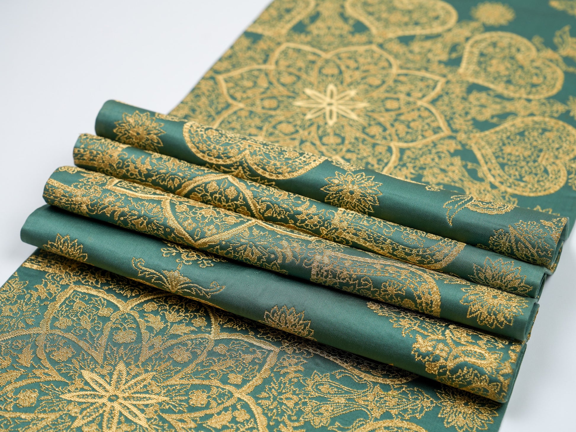 Anchor your tablescape with the quiet authority of the "Jade Sovereign." Crafted from a vintage Fukuro Obi, this runner features deep celadon jade silk illuminated by high-wattage Kinran gold brocade. Symmetrical mandalas and paisley motifs symbolize eternal fortune, catching candlelight with mesmerizing depth. Its heavyweight structure lies flat with regal precision, bridging antique grandeur and modern luxury. A truly singular heirloom for the festive season. Only one piece exists.