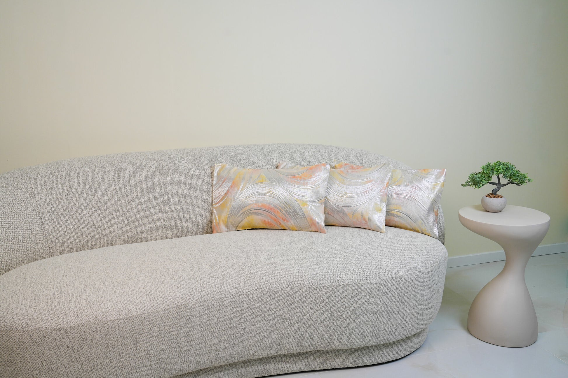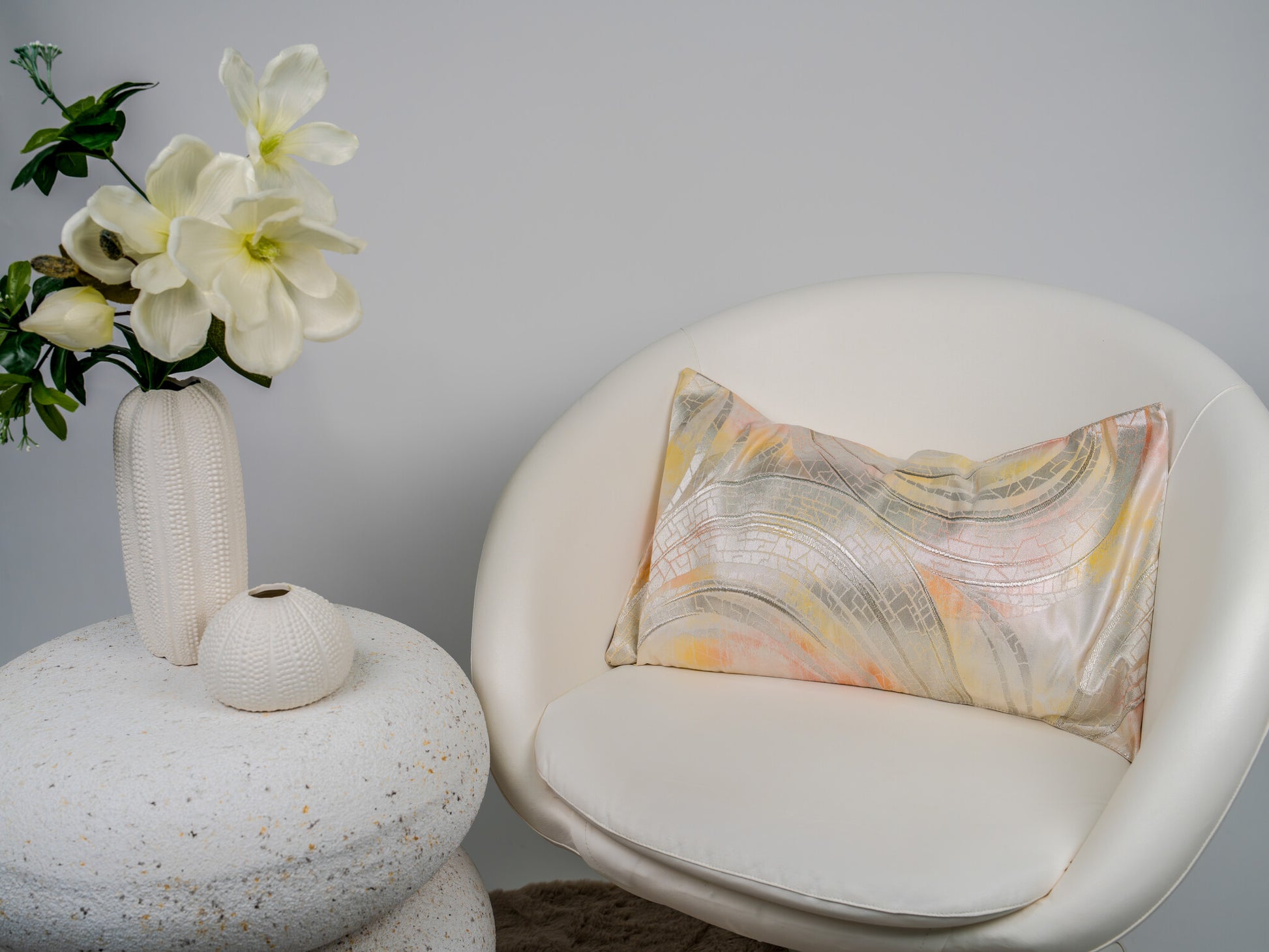 Immerse your interior in the iridescent calm of The Nacreous Champagne Tide by Renaras. This bespoke cushion is a study in light and fluidity, capturing the lustrous beauty of mother-of-pearl (Raden). The design features sweeping, abstract currents that wash across the surface in a delicate palette of champagne gold, cool silver, and whisper-soft apricot.