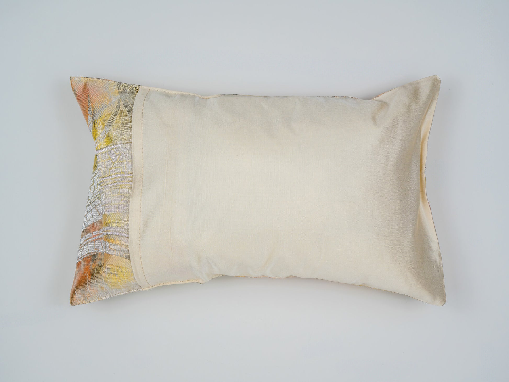 The textile boasts a unique, mosaic-like texture reminiscent of cracked ice or light refracting through shallow water, giving it a modern, almost liquid appearance. Hand-tailored from an authentic vintage Japanese Obi, this 30x50cm art piece is finished with a seamless envelope closure and a cream silk back, preserving its pristine, sculptural form. As a refined expression of sustainable luxury, it serves as a high-end interior accent that adds a serene, airy sophistication to any living space.