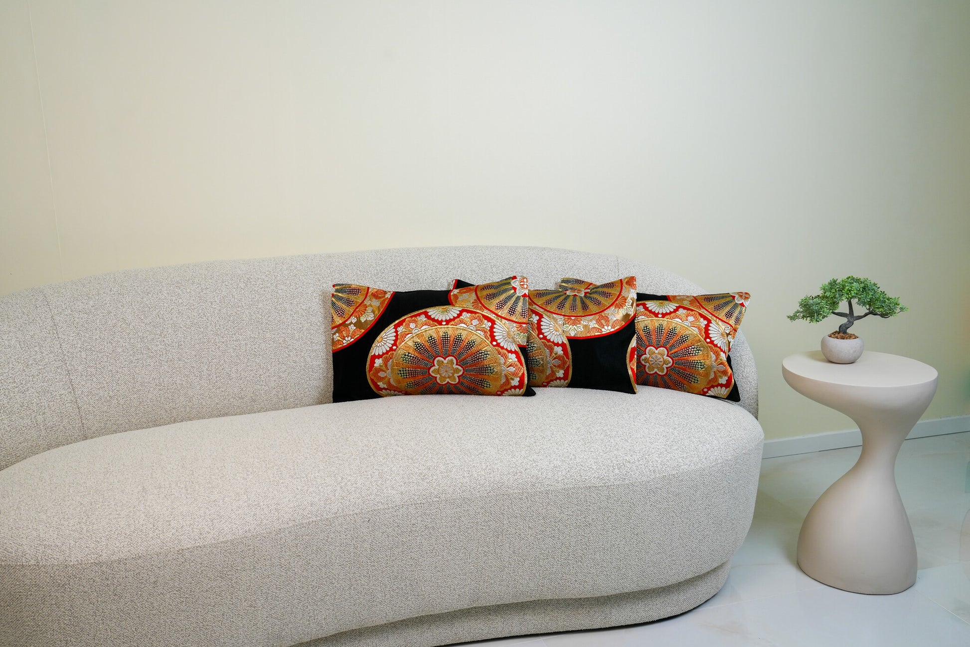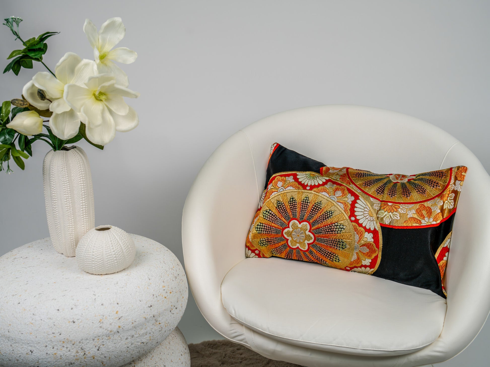 Introduce a dramatic focal point to your home with the Miyako Noir Lumbar Pillow, a standout addition to the Renara Heritage Collection. Expertly crafted from an authentic vintage Japanese Obi, this piece juxtaposes deep, lacquer-black silk with vibrant embroidery in burnt orange, vermilion, and metallic gold.
