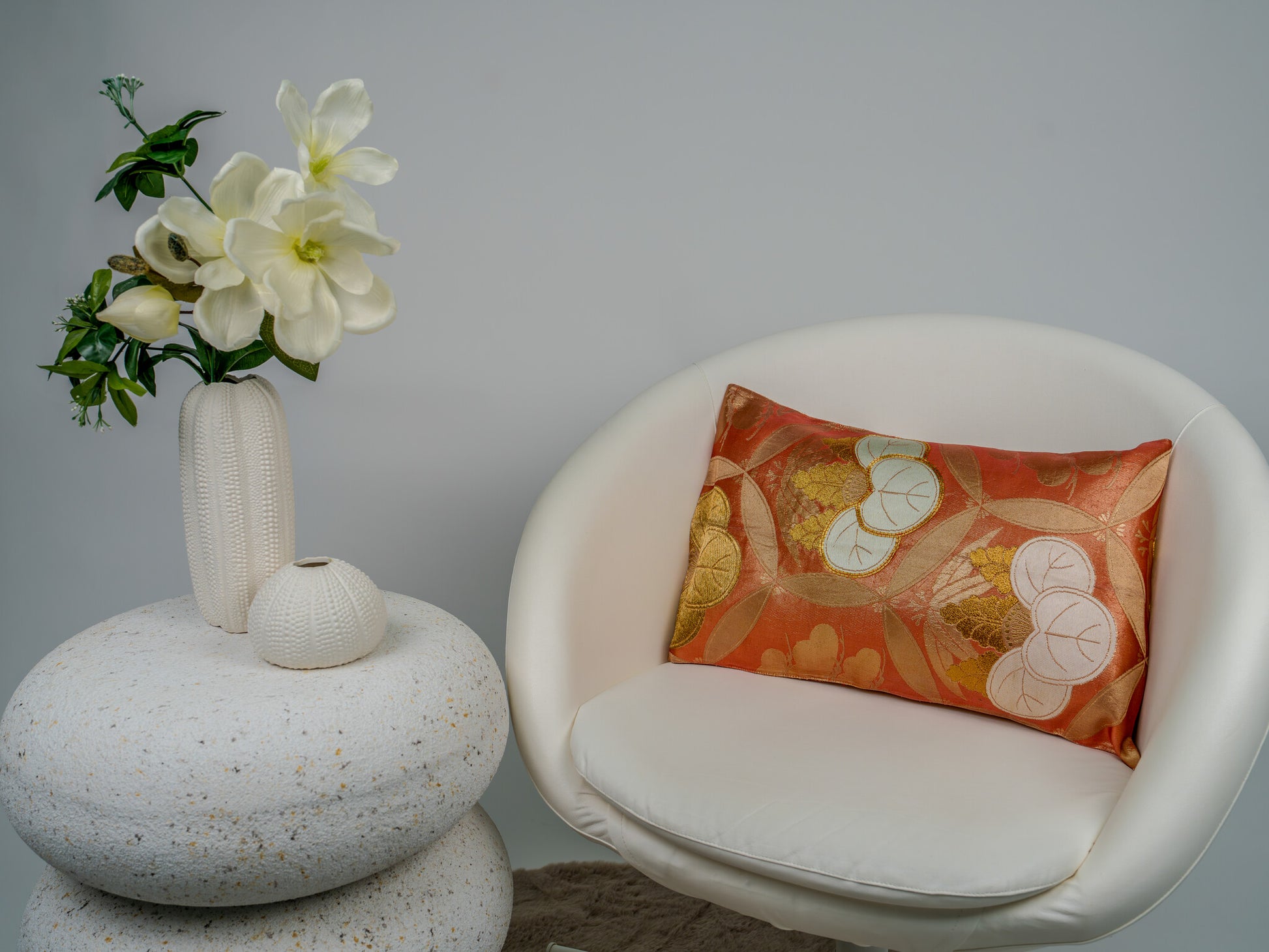 Ignite your interior with the spirited elegance of The Persimmon Aoi Heritage by Renaras. This bespoke cushion is saturated in a deep, auspicious persimmon (Kaki-iro) hue—a color traditionally believed to ward off evil. The textile features bold, ceremonial Maru-mon (circular roundels) encasing stylized Aoi (Hollyhock) leaves, a motif historically associated with the Tokugawa Shogunate and symbolizing power, longevity, and divine lineage.