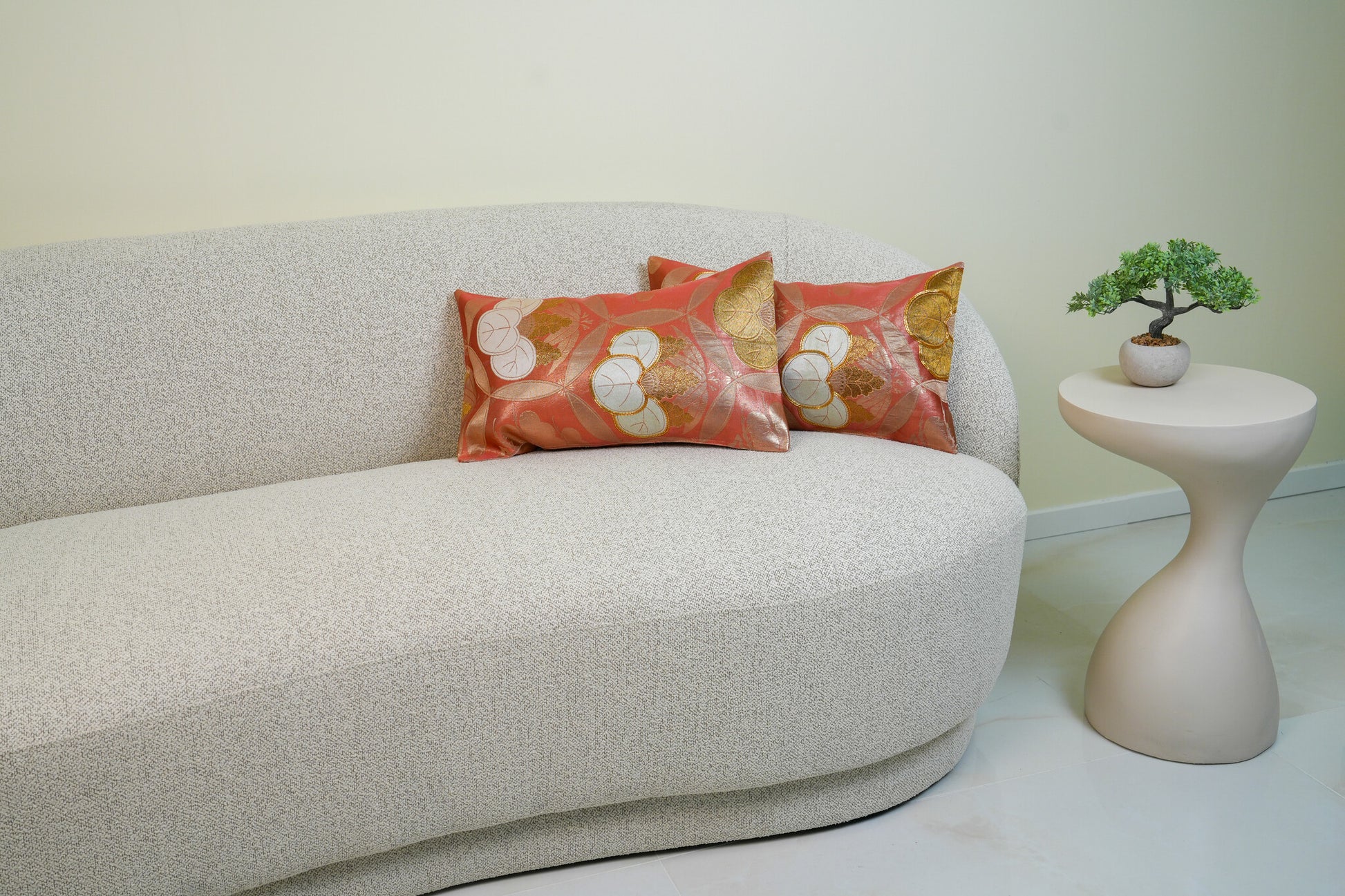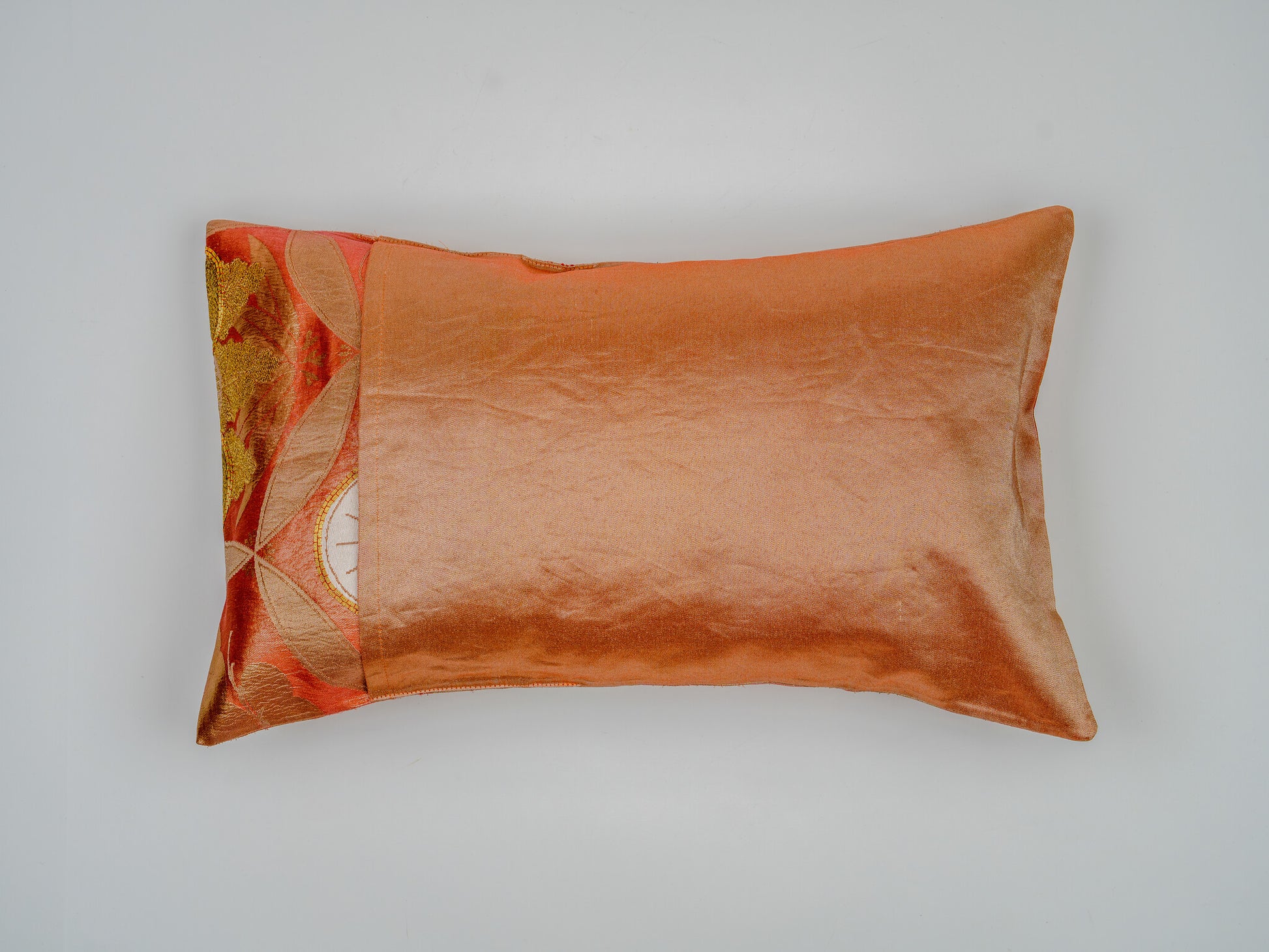 The crests are embroidered in textured relief using white, pale celadon, and metallic gold threads, creating a striking contrast against the geometric Shippo (Seven Treasures) background lattice. Hand-tailored from an authentic vintage Japanese Obi, this 30x50cm art piece is finished with a seamless envelope closure, ensuring a flawless silhouette. A vibrant example of sustainable luxury, it acts as a high-end interior accent that infuses contemporary spaces with imperial history and vitality.