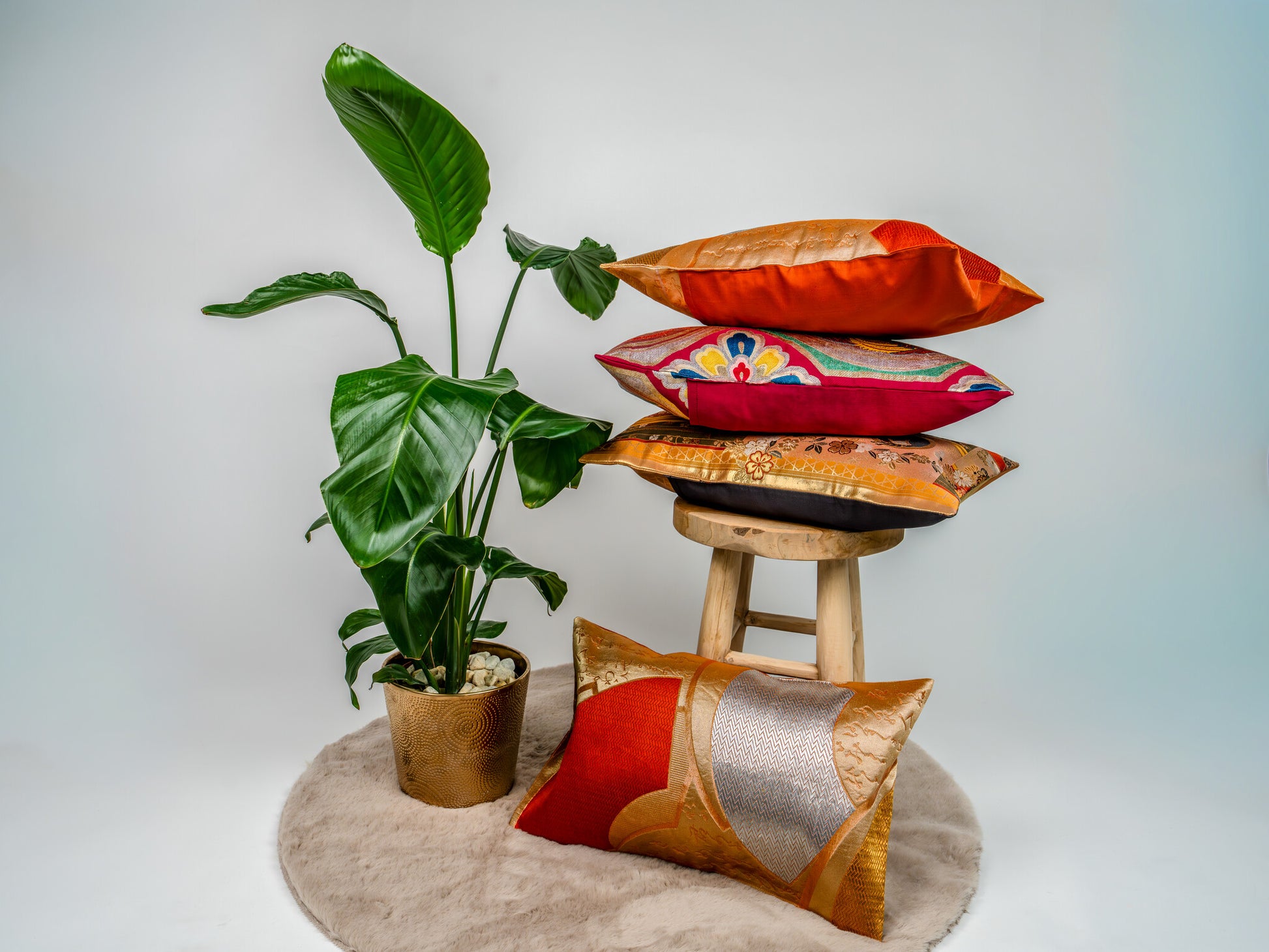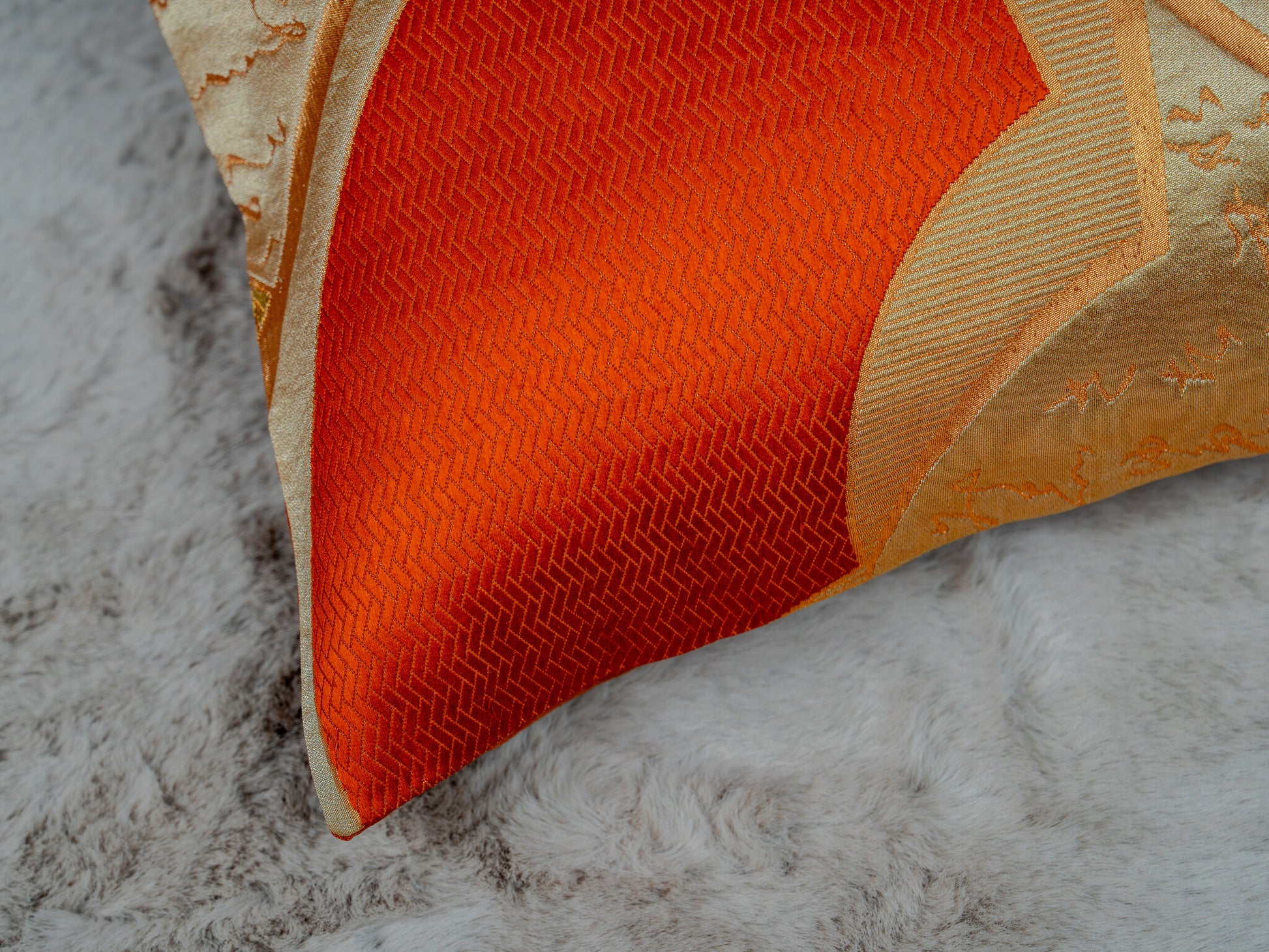 Defined by its striking architectural composition, The Persimmon Silver Collage by Renaras is a bold fusion of tradition and modernist design. This bespoke cushion features a dynamic interplay of textures: a vibrant panel of persimmon (Kaki-iro) silk woven in a sharp herringbone chevron, contrasted against a cool, shimmering silver diamond lattice and accents of burnished gold.