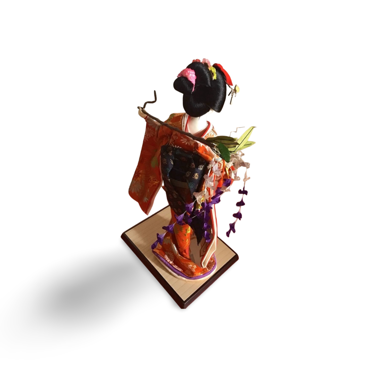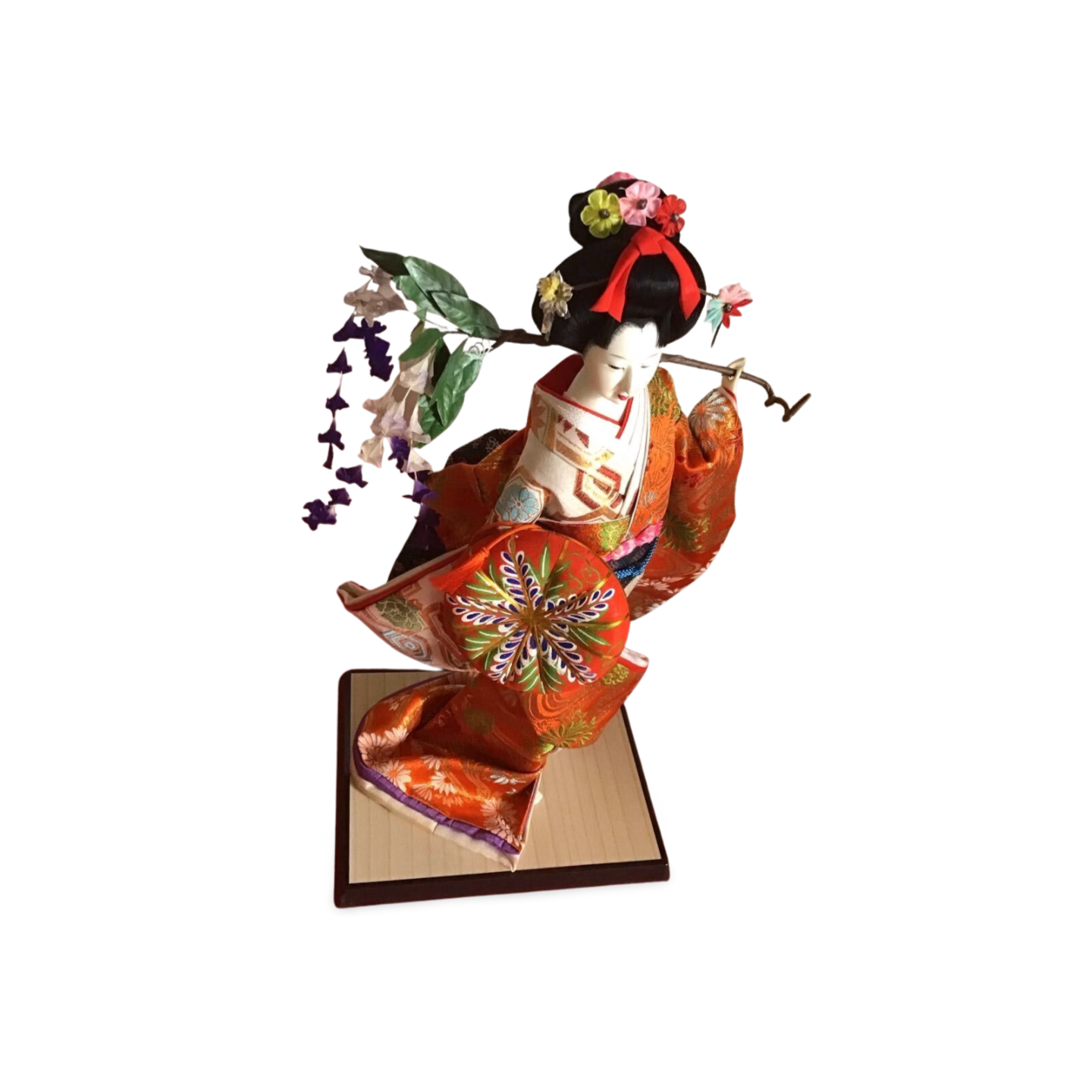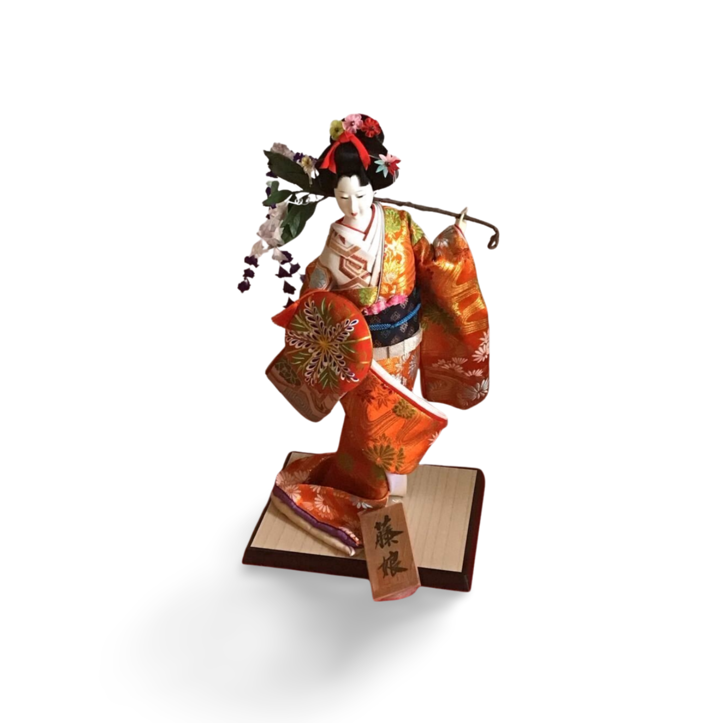 Unlike static figures, the Fujimusume is full of movement. She holds a large, black lacquer-style hat draped with delicate cascades of handmade wisteria blossoms over her shoulder, symbolizing the weight of love and the beauty of spring. Her face, finished in traditional Gofun (crushed shell powder), features a demure, downward glance that is characteristic of the "Nihon Buyo" classical dance style.