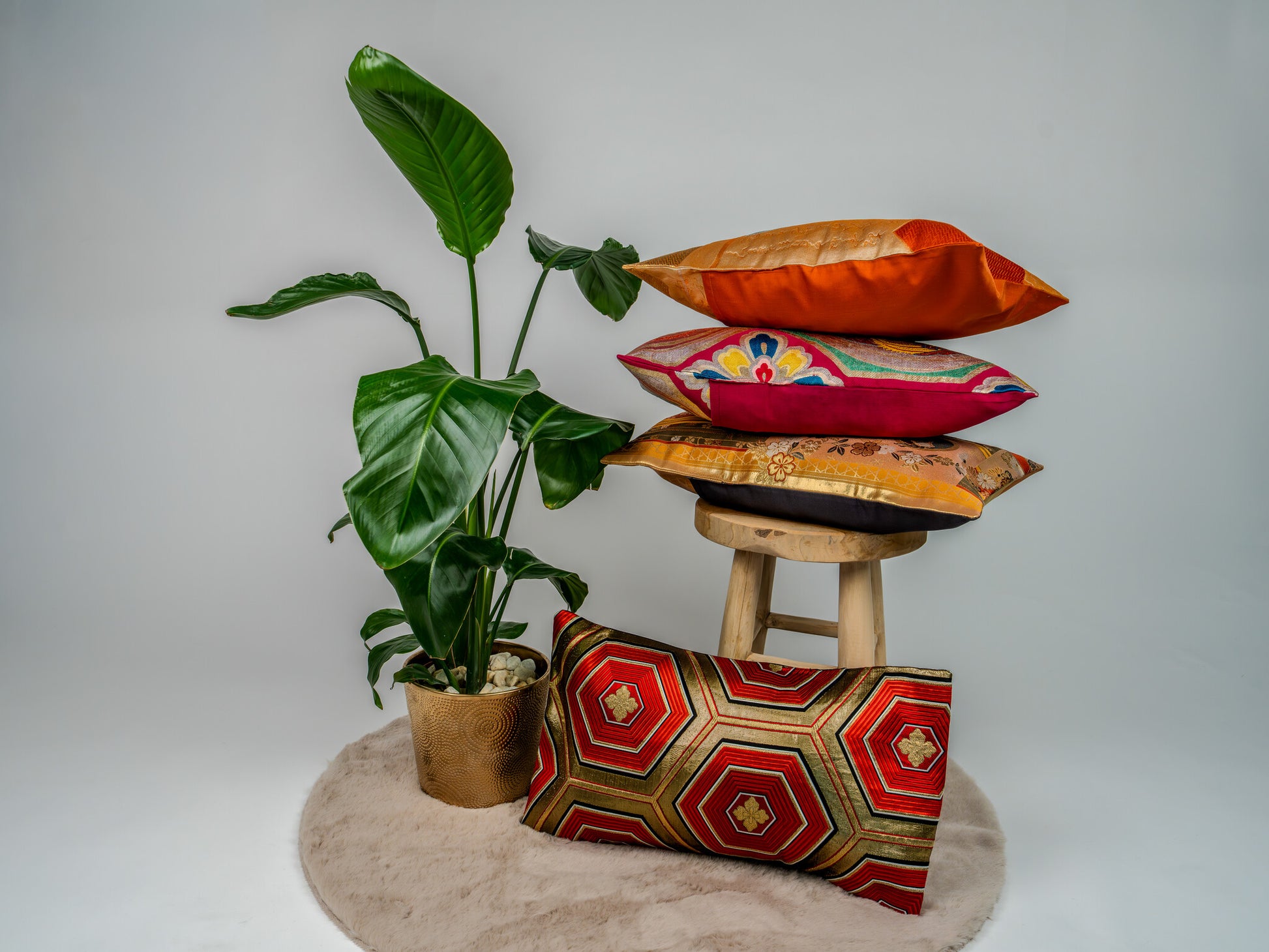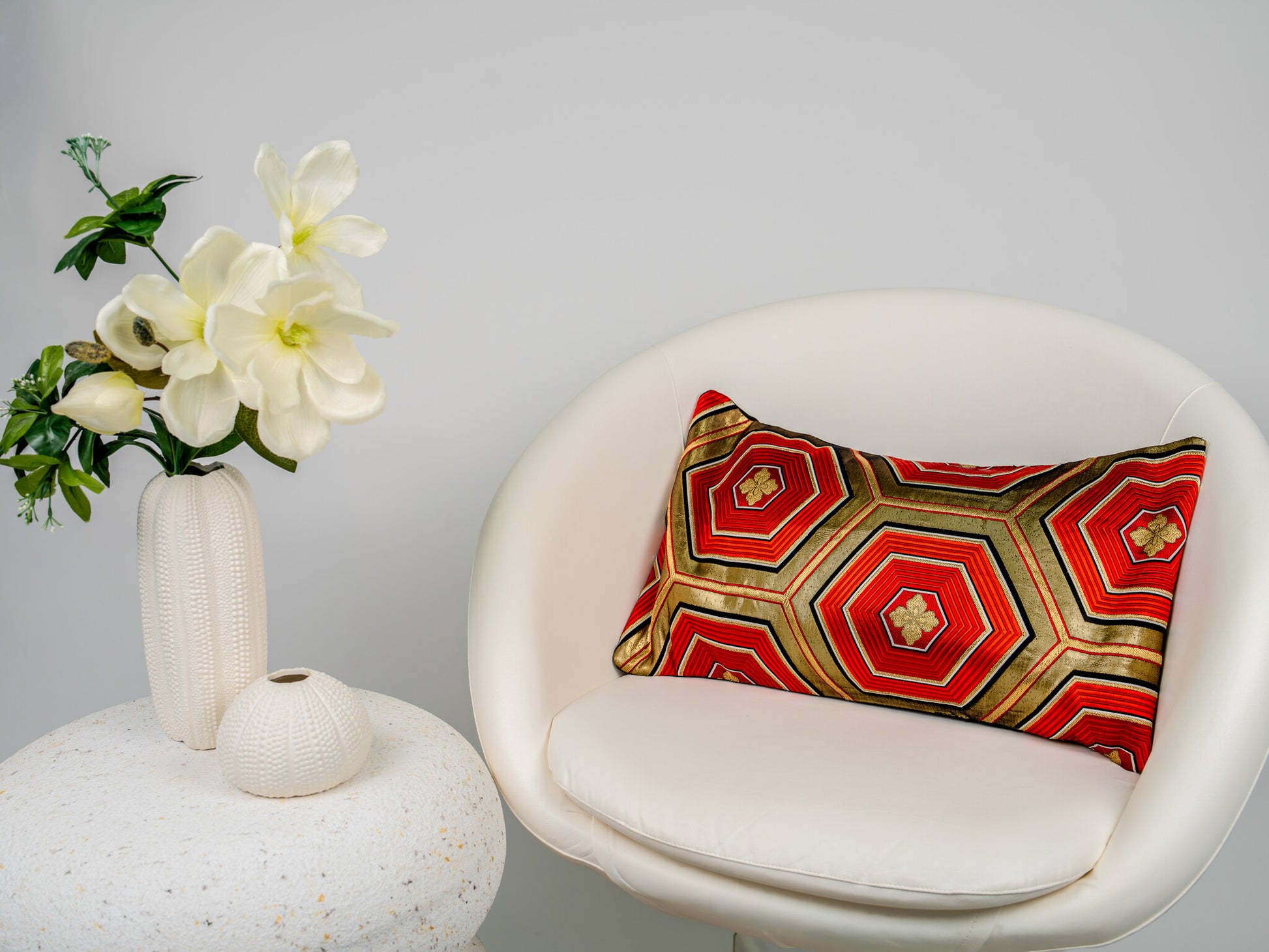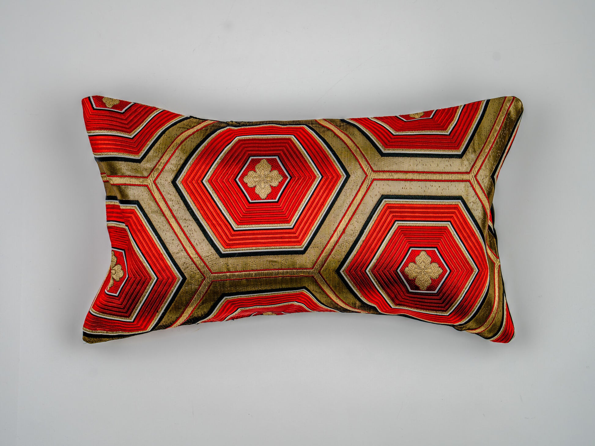 The intricate, multi-layered embroidery creates a hypnotic depth, where central floral crests (Hanabishi) float within the architectural framework. Hand-tailored from an authentic vintage Japanese Obi, this 30x50cm statement piece is finished with a seamless envelope closure to maintain its clean lines. As a powerful expression of sustainable luxury, it acts as a high-end interior accent that brings a sense of order, history, and vibrant energy to the contemporary home.