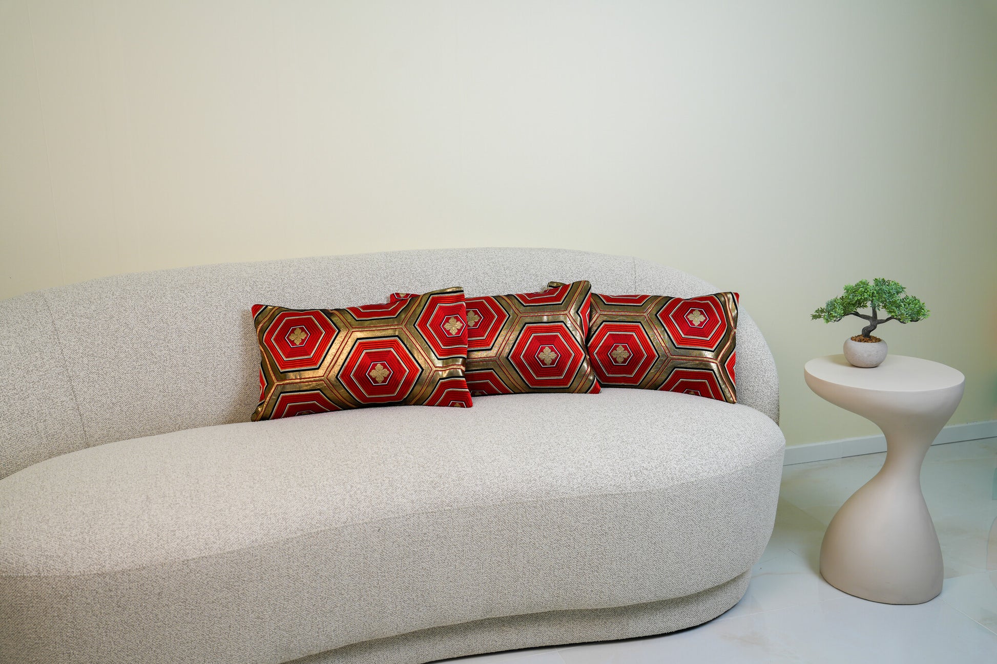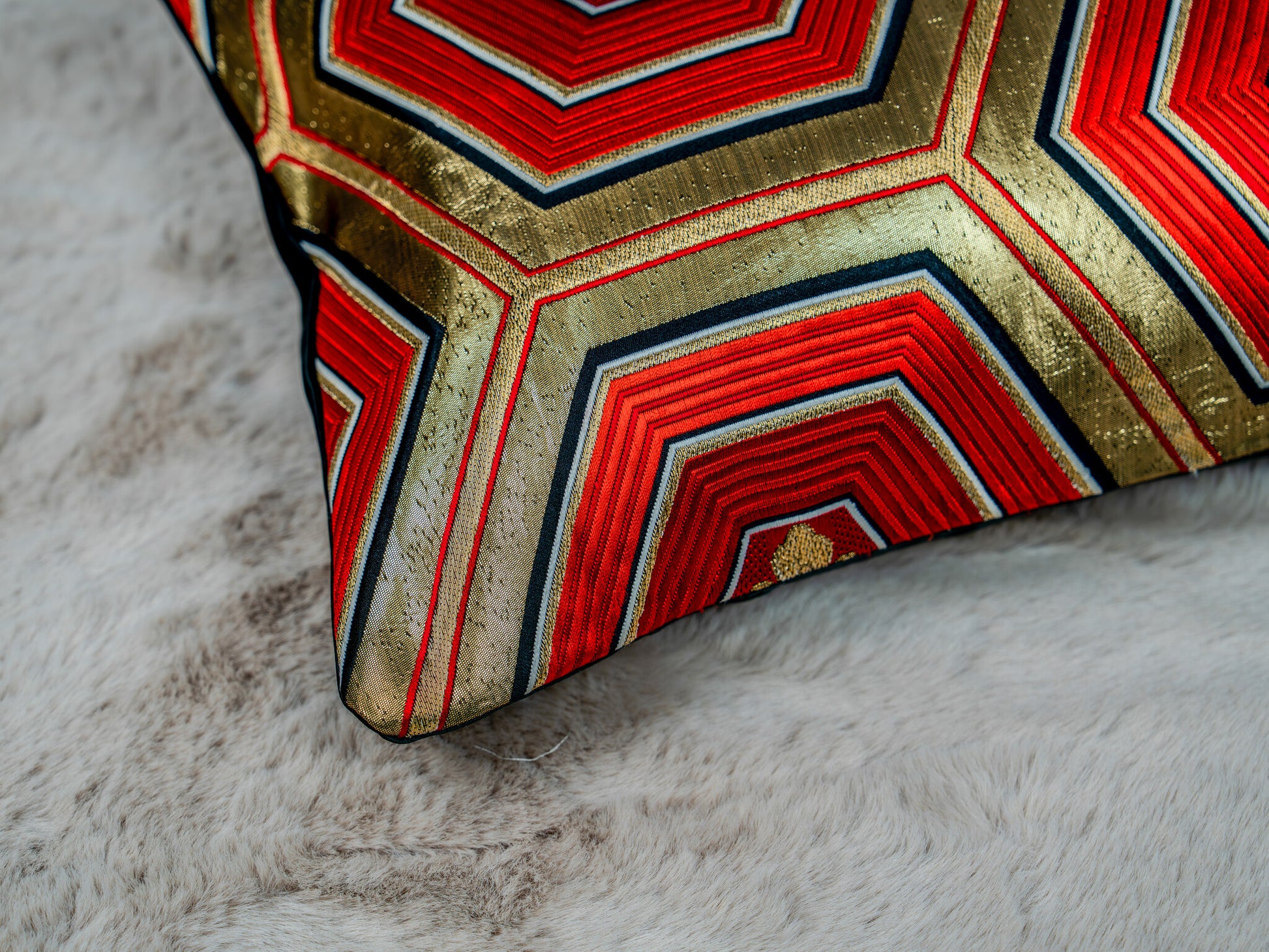 Structure your space with the bold geometry of The Vermilion Kikkō Vanguard by Renaras. This bespoke cushion commands attention with its striking Kikkō (tortoiseshell) lattice—a traditional symbol of longevity and protection. The design features hexagonal medallions rendered in deep vermilion and burnished gold, accented with flashes of platinum silver against a midnight black silk ground.