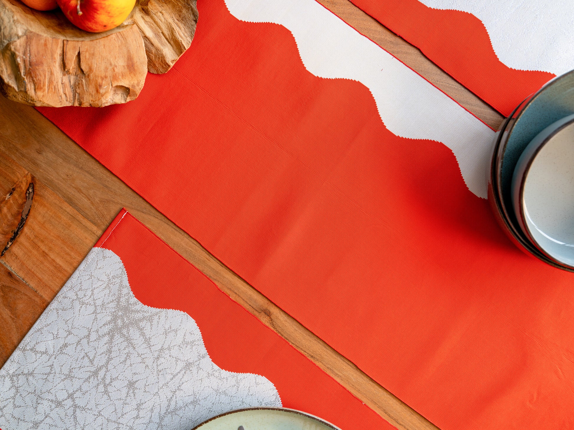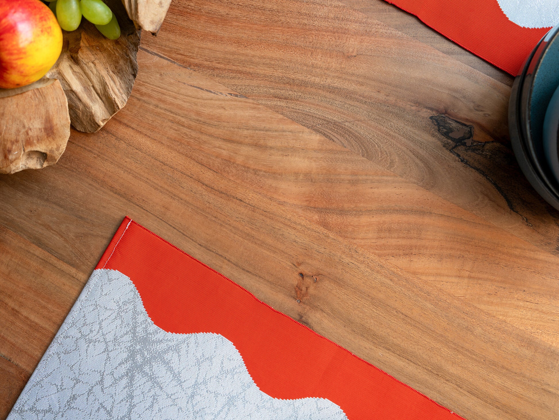 While the "Vermilion Tides" runner captures the fluid motion of a shoreline, its coordinated placemat imposes a sophisticated, architectural structure. This piece is a masterclass in graphic clarity, crafted from the same heavyweight vintage silk.